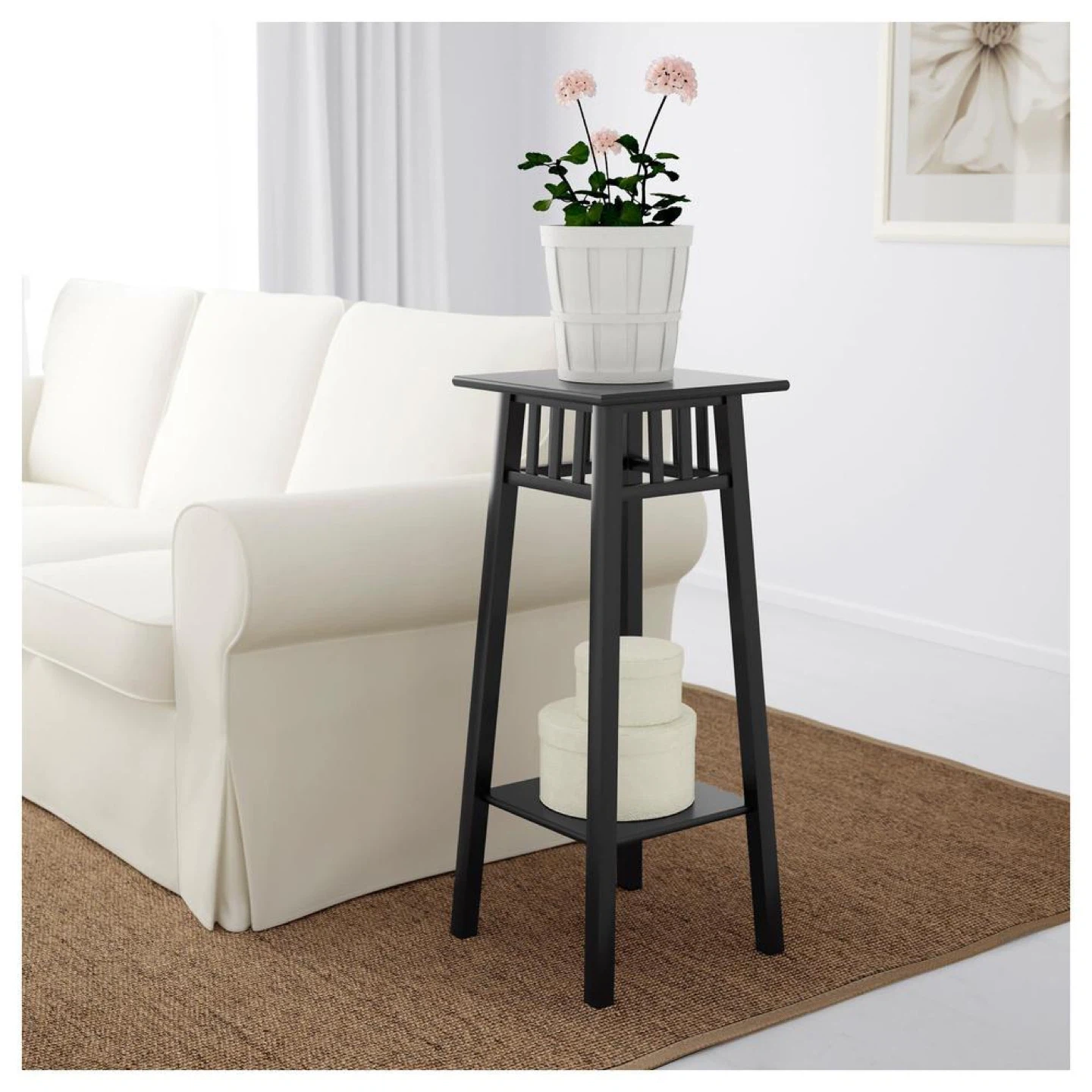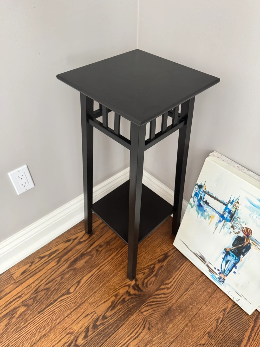 This is a tall, black accent table with two tiers for storage or display. Its simple, modern design makes it a versatile addition to any room. Perfect for holding a plant, books, or decorative items.