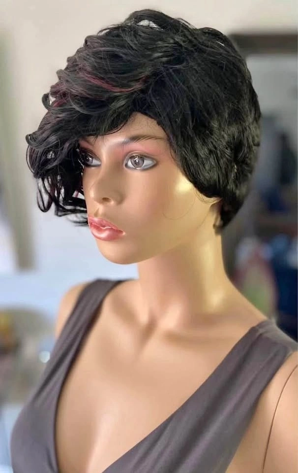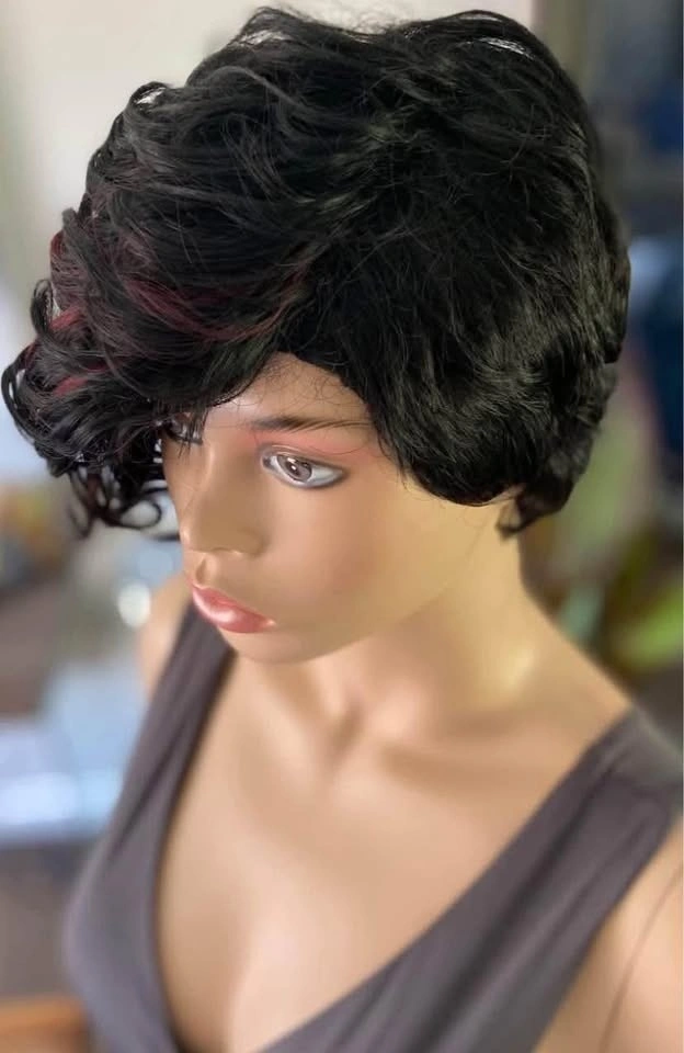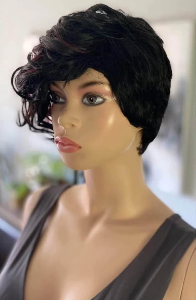 NWT: Pixie Style Short Asymmetrical Black Synthetic Wig with Red Wine Burgundy Highlights (678)