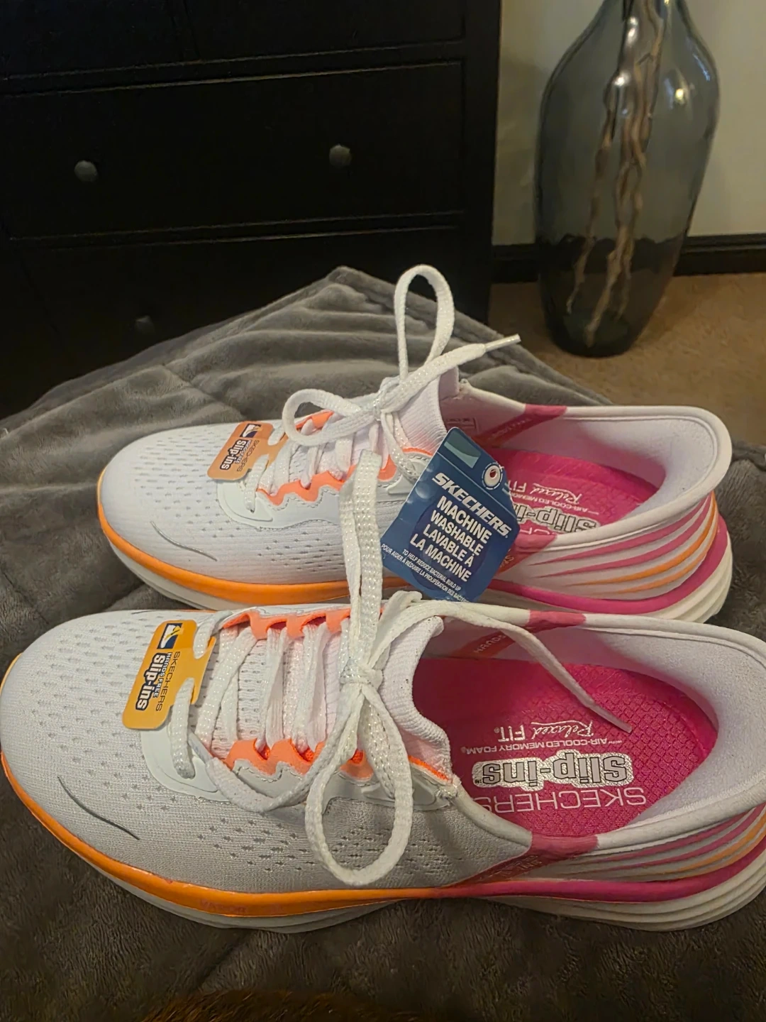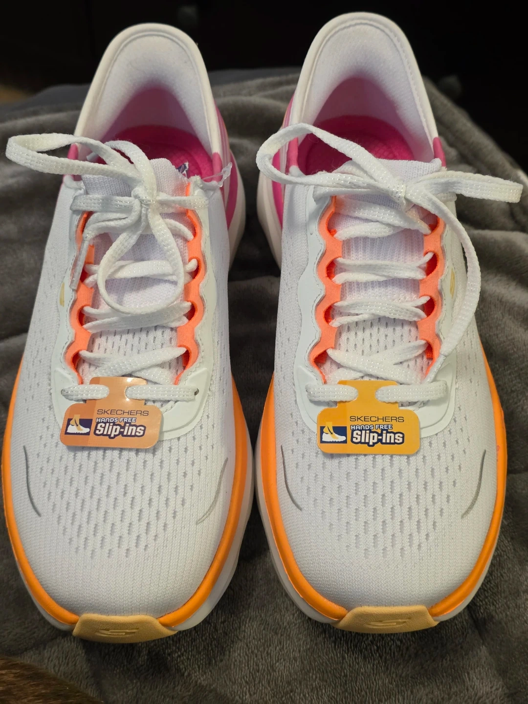 These are a pair of brand new Skechers Slip-ins Relaxed Fit shoes in a women's size 7! They are machine washable and feature hands-free technology for easy wear.
