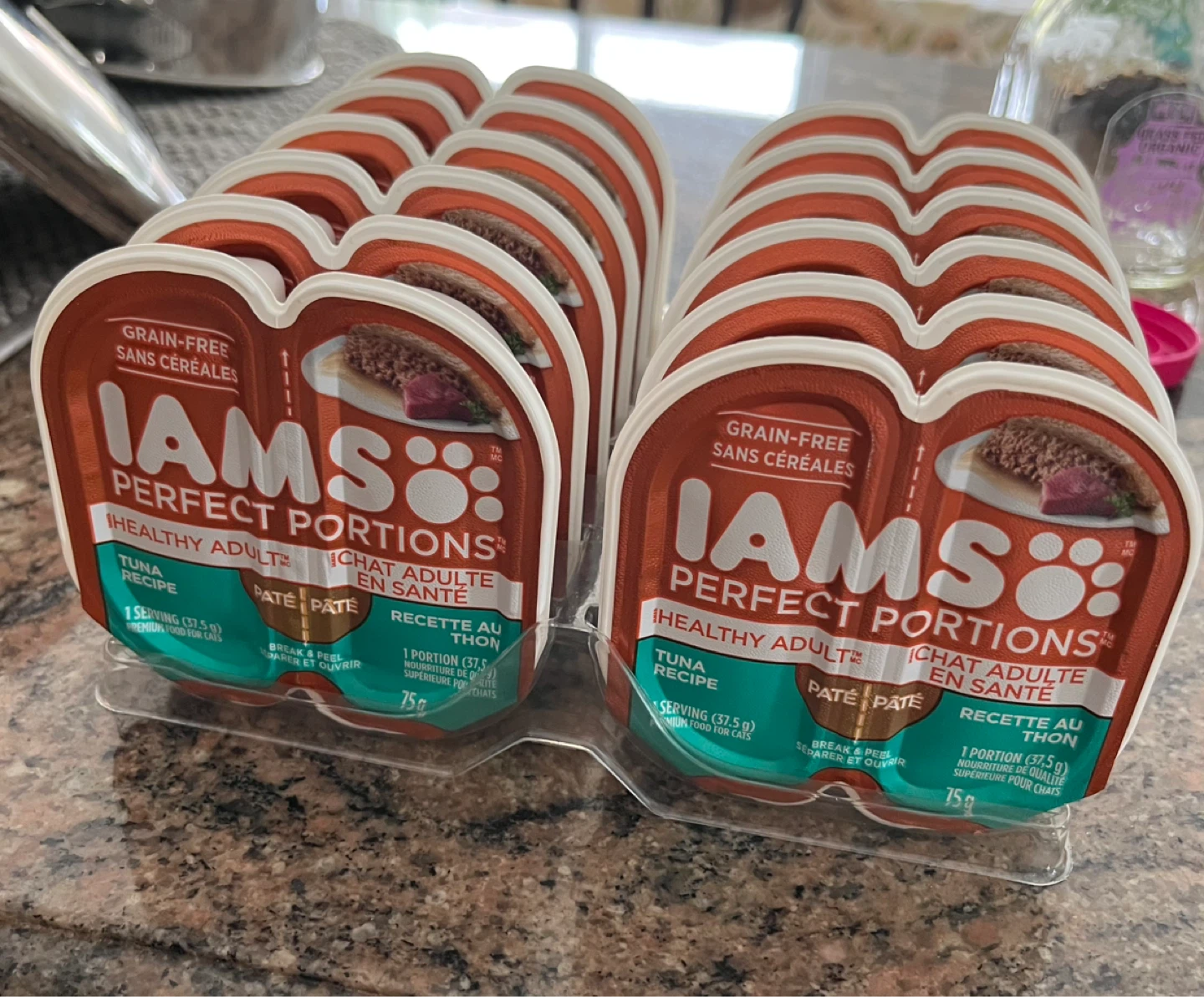 42 Iams Perfect Portions Grain-Free Tuna Recipe cat food. Each serving is 75g. Best before date is December 15, 2027.