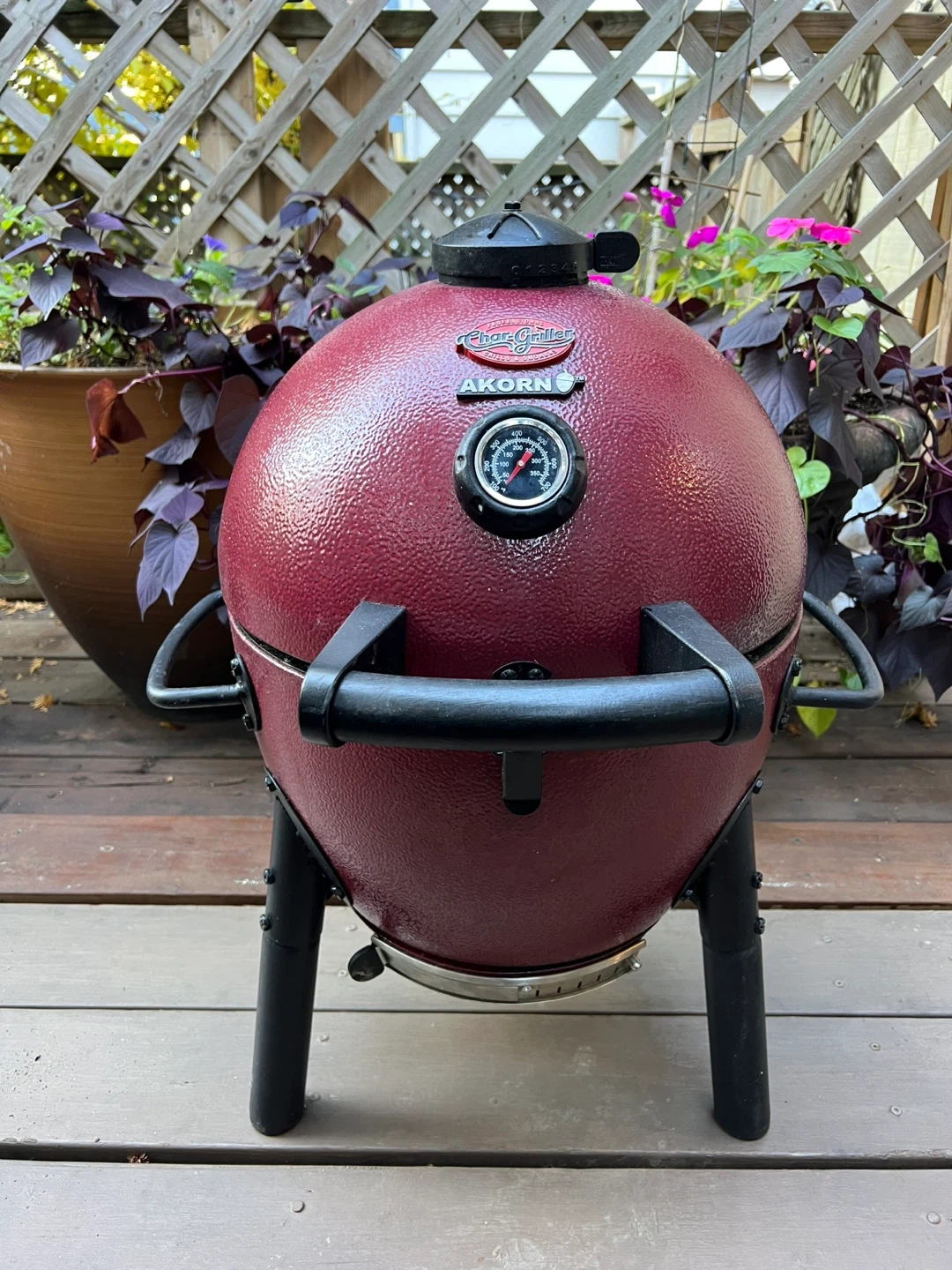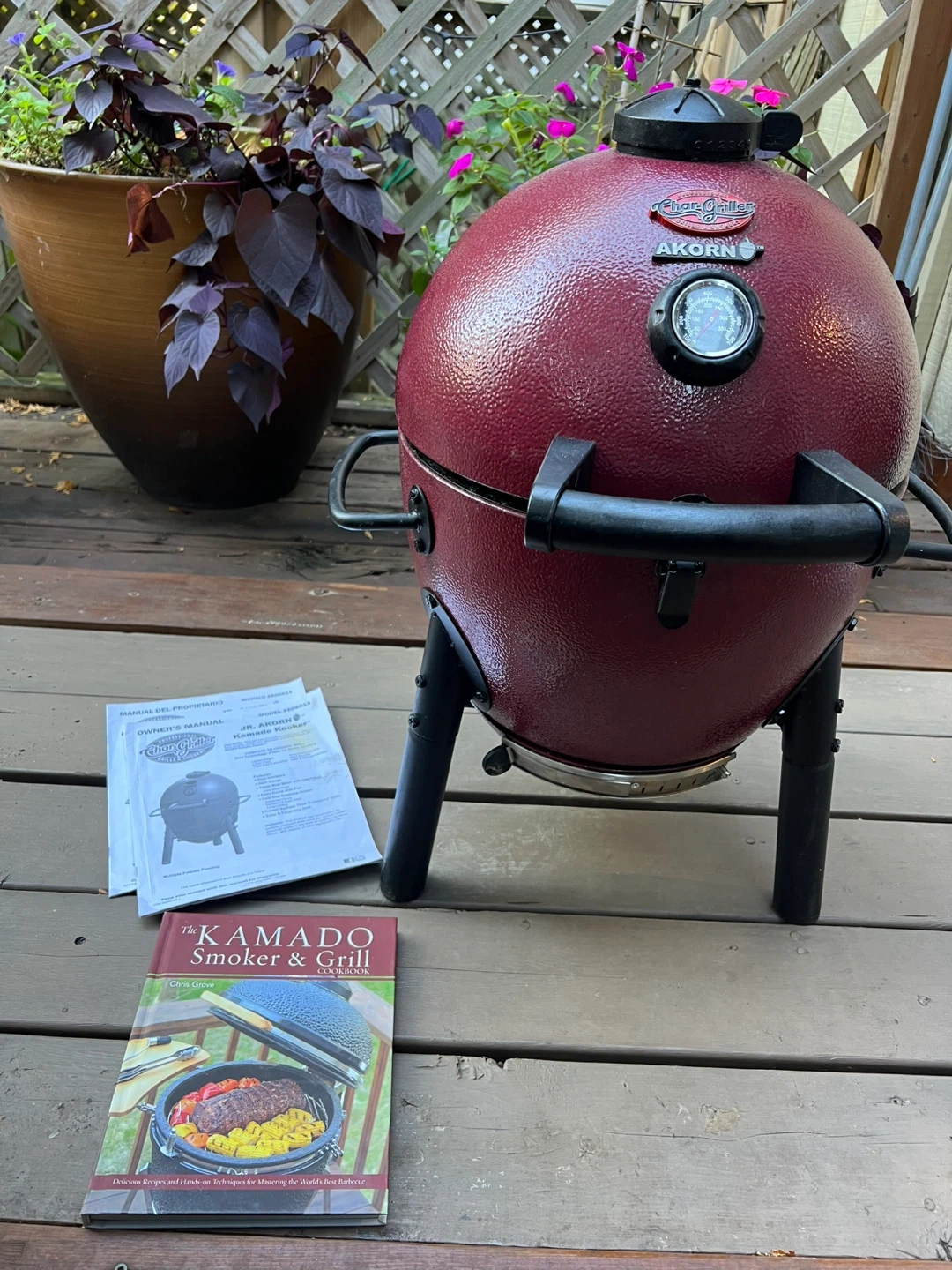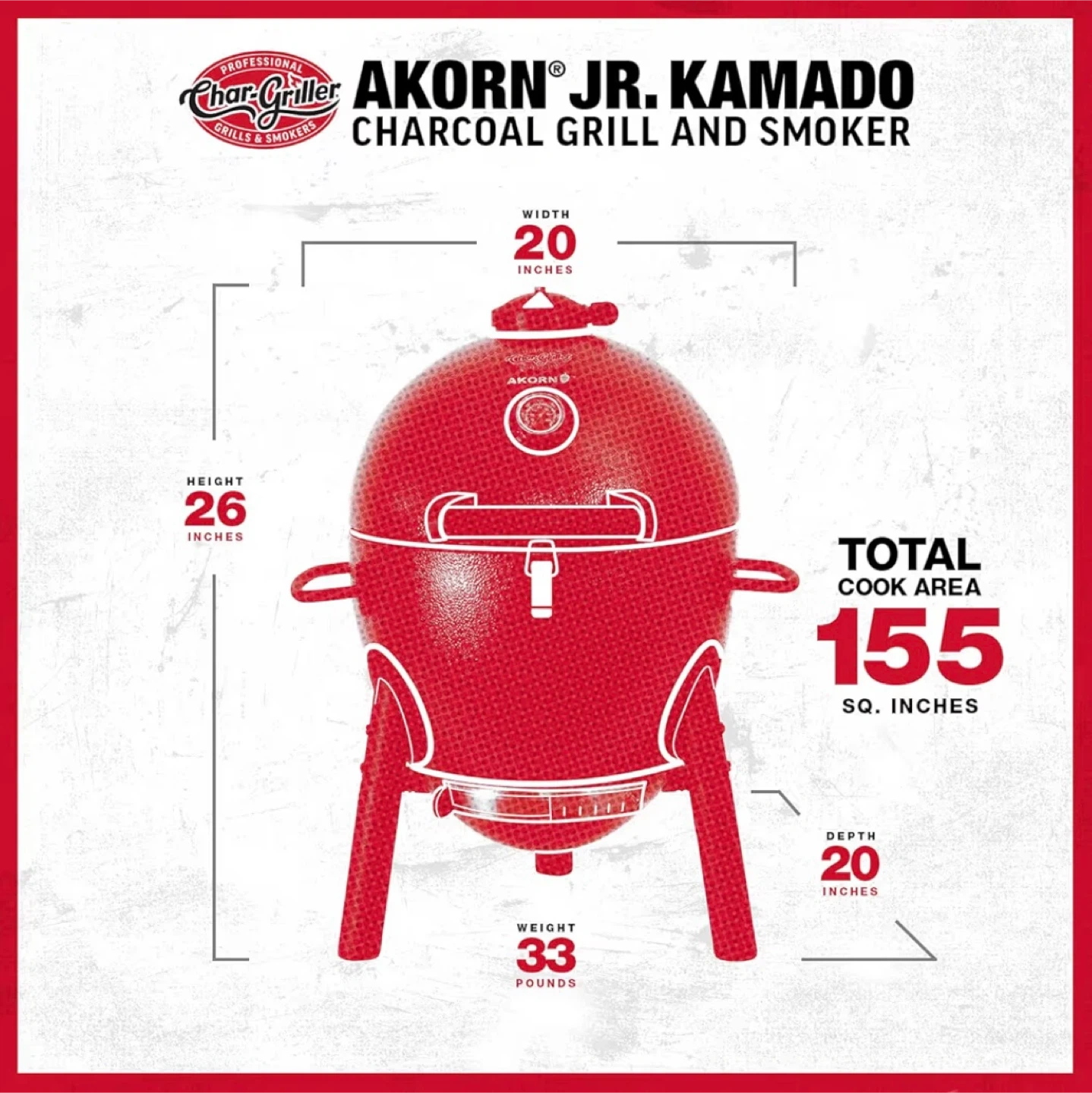 60Char-Griller AKORN Jr. Kamado Charcoal Grill. With optimal fuel efficiency and ultimate cooking versatility for high heat searing or low temperature smoking. Used condition- still in excellent shape. Comes with user manual and Kamado Smoker & Grill cookbook. Please see last photo for dimensions!