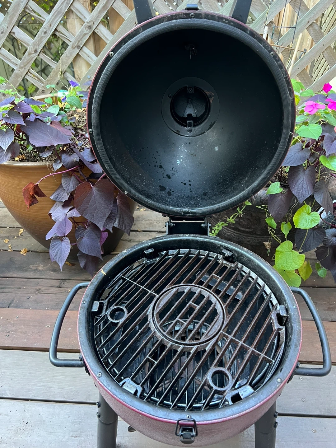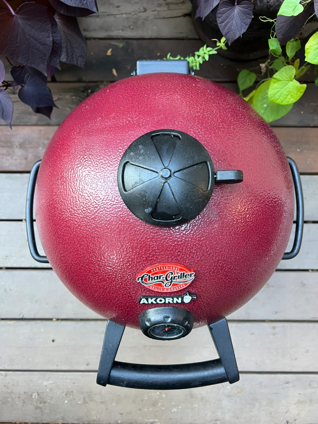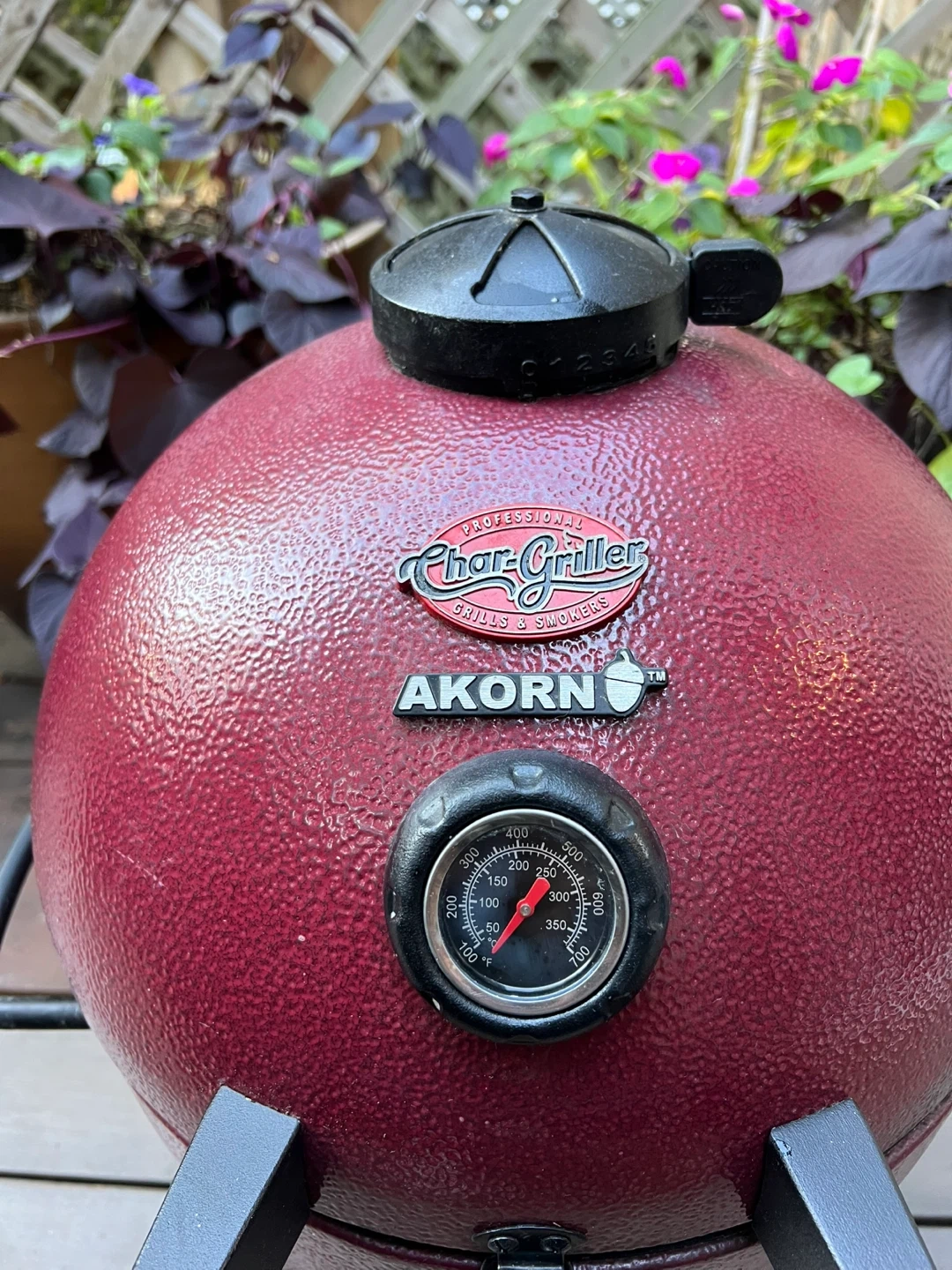 60Char-Griller AKORN Jr. Kamado Charcoal Grill. With optimal fuel efficiency and ultimate cooking versatility for high heat searing or low temperature smoking. Used condition- still in excellent shape. Comes with user manual and Kamado Smoker & Grill cookbook. Please see last photo for dimensions!