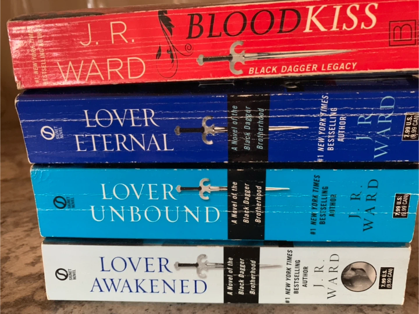Selling books by J.R. Ward! Includes Bloodkiss, Lover Eternal, Lover Unbound, and Lover Awakened. They were originally $9.99 CAN each. Perfect for anyone who loves paranormal romance novels!