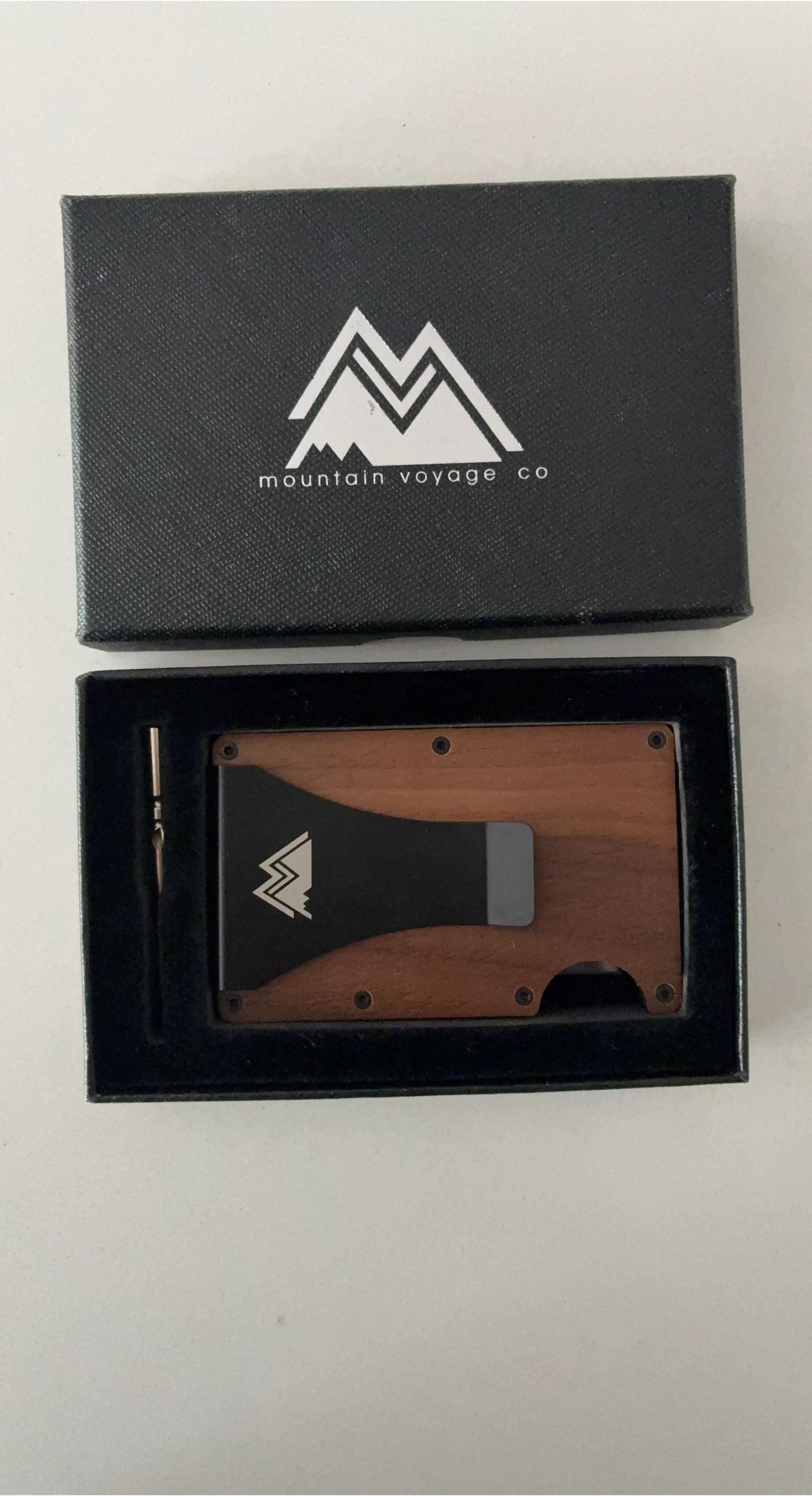 This Mountain Voyage Co. wallet is crafted from wood and metal. It's a slim design that fits easily in your pocket. Includes a small tool for adjustments. Comes in its original box.