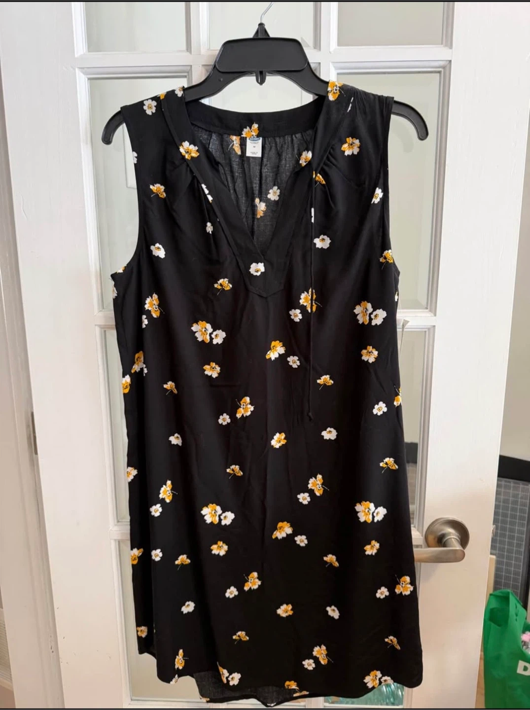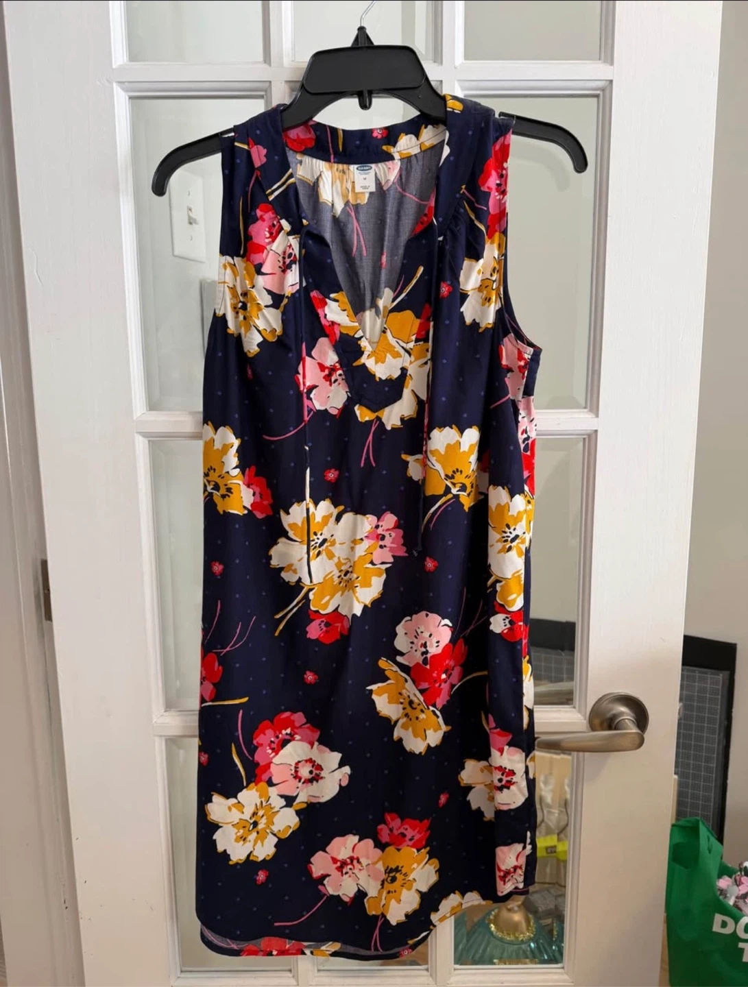 This is a sleeveless Old Navy dress with a navy blue floral print and a tie neck. It's a comfortable and breezy option for warmer weather. This dress is great for casual outings or a day at the beach!