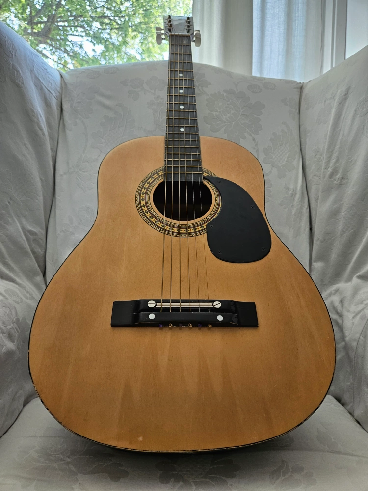 It is in fair-good condition , perfect for someone looking for a campfire guitar or a quick guitar to pick up and practice on.