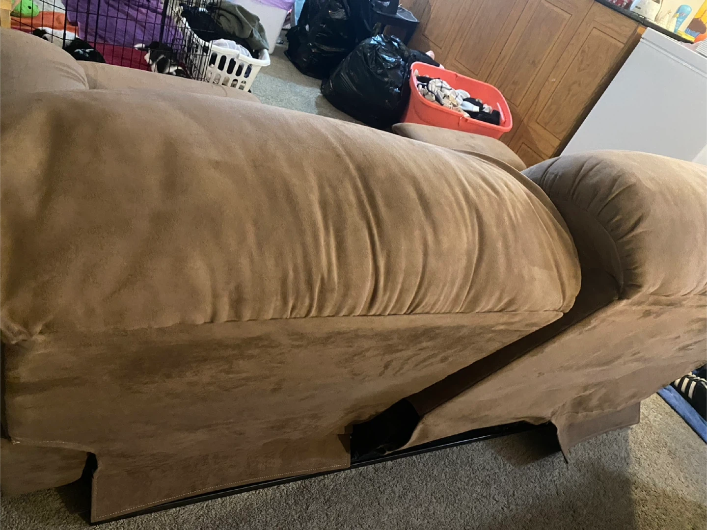 Three-seater reclining sofa and a reclining chair in a soft brown fabric. It has three seats with reclining sofa footrests and padded headrests. This sofa and chair offers comfortable seating for the whole family. I would like to get rid of them as soon as possible.