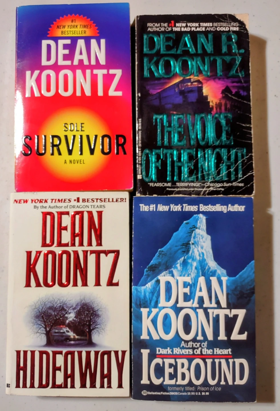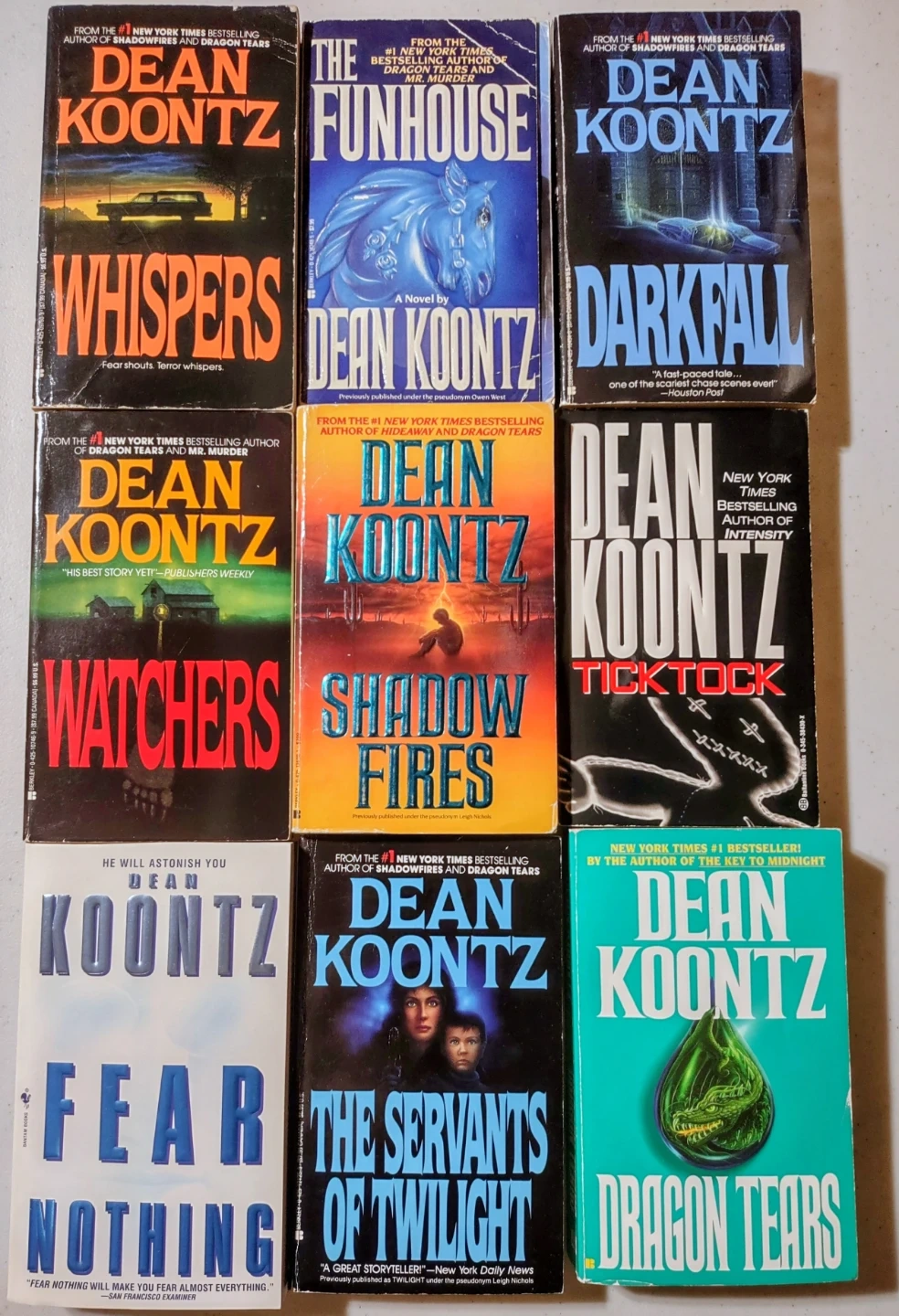 This is a collection of 31 paperback novels by Dean Koontz. Titles include 'Mr. Murder', 'Winter Moon', 'Strange Highways', 'Midnight', 'The House of Thunder', 'Strangers', 'Cold Fire', 'The Mask', 'Lightning', 'Survivor', 'The Voice of the Night', 'Hideaway', 'Icebound', 'From the Corner of His Eye', 'Dark Rivers of the Heart', 'The Door to December', 'False Memory', 'The Eyes of Darkness', 'Intensity', 'One Door Away, From Heaven', 'The Face', 'The Bad Place', 'Whispers', 'Watchers', 'The Servants of Twilight', and 'Dragon Tears'. All books are in good condition.