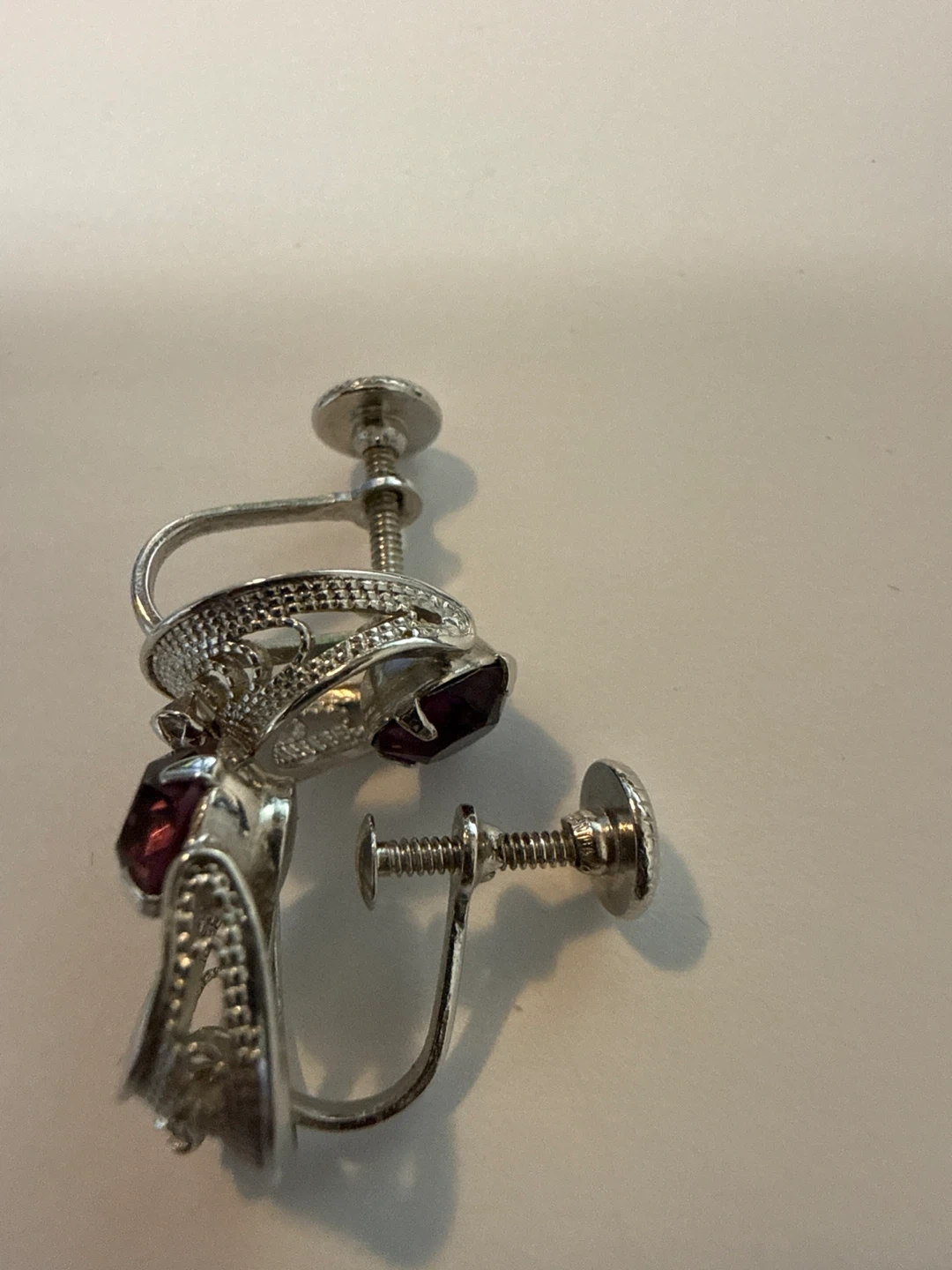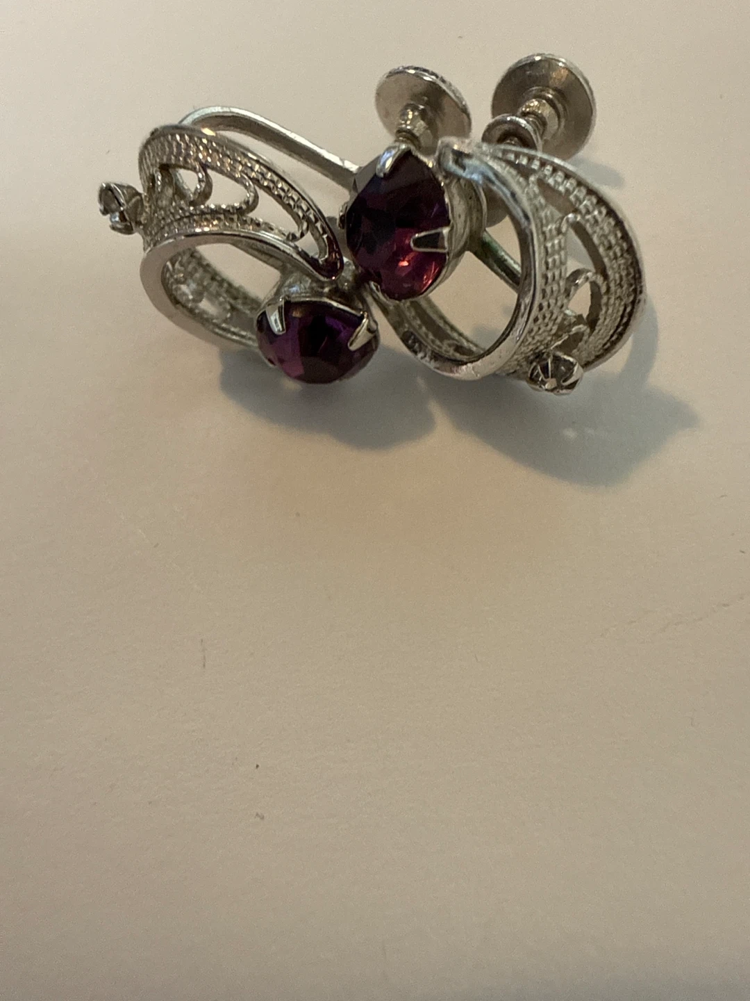 A pair of vintage screw-back earrings featuring a silver-tone metal setting. These earrings have a decorative filigree design with two faceted purple stones. They're designed for non-pierced ears.