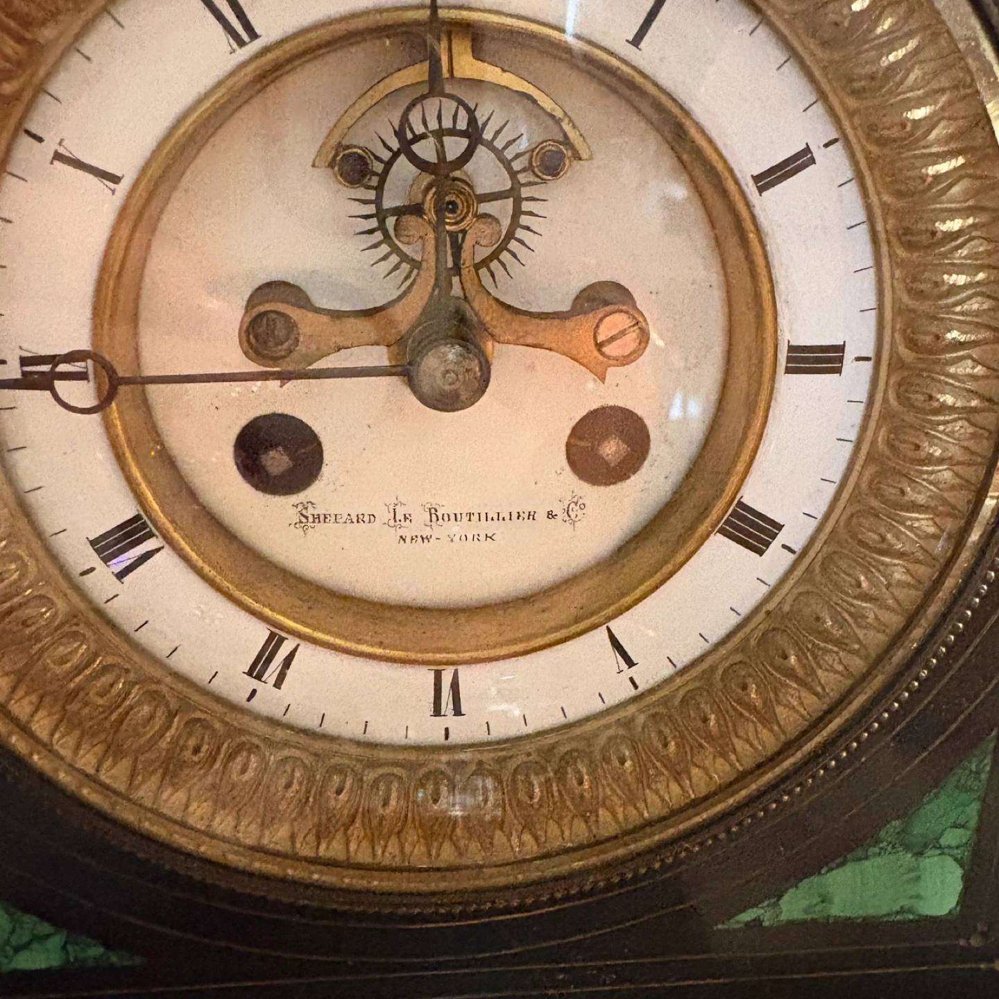This is a beautiful mantel clock from Shepard & Butler in New York. It features a detailed dial with Roman numerals and a decorative, ornate casing. The clock's body is black with green accents. It's a lovely piece for a mantle or shelf. Vintage, one of a kind rare find