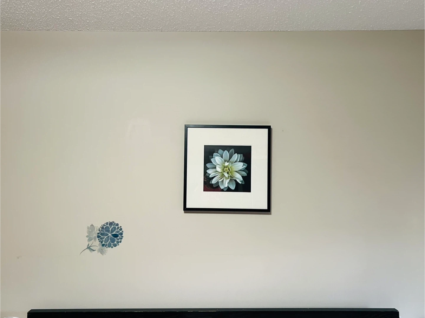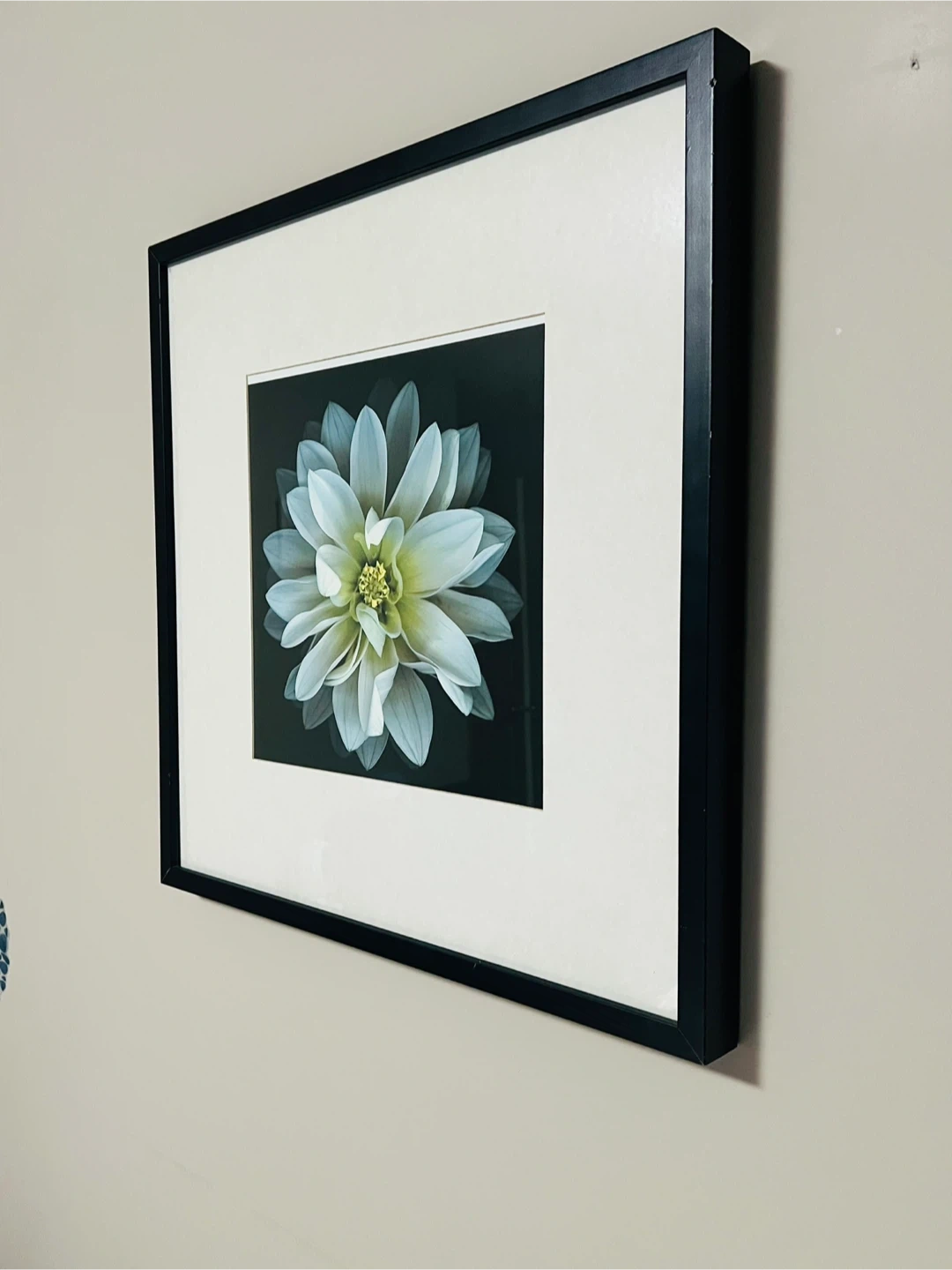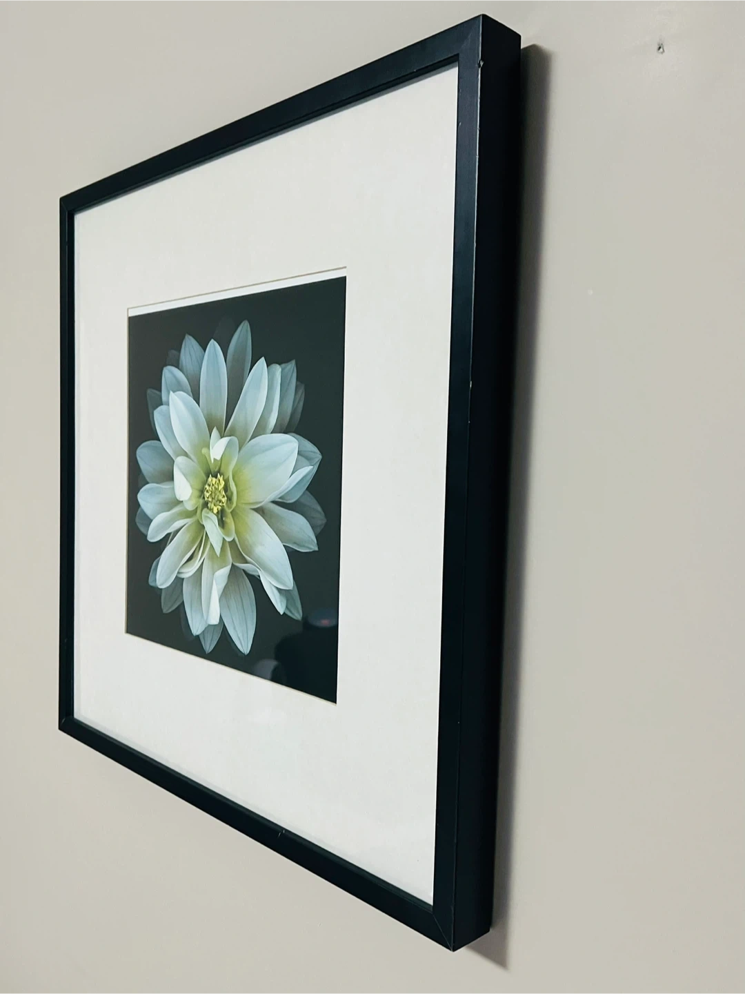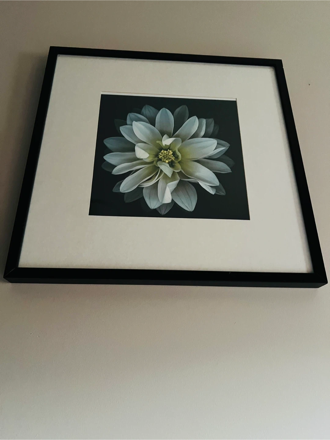 A lovely piece of wall art featuring a floral print with a black frame. It's in great condition and ready to add a touch of elegance to your home.
