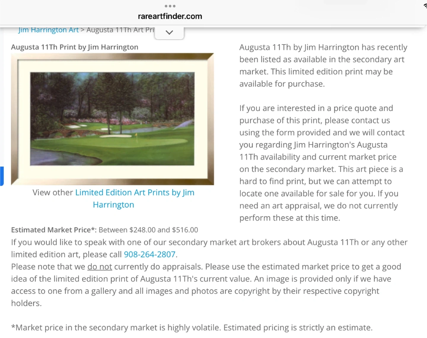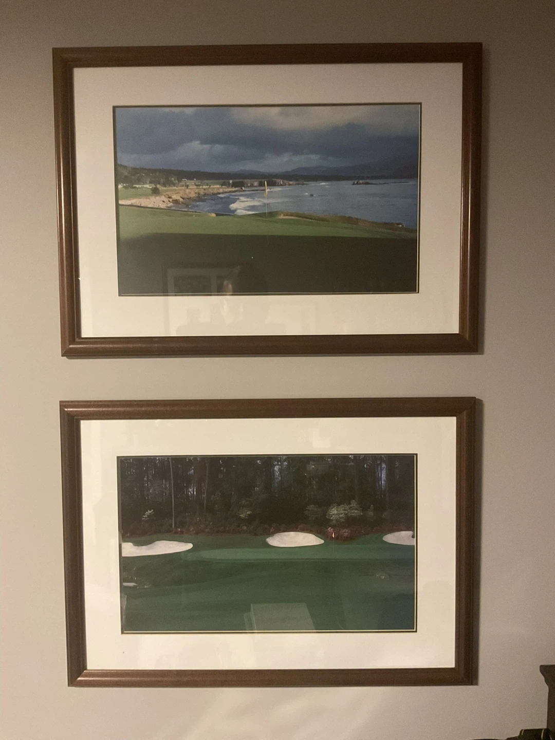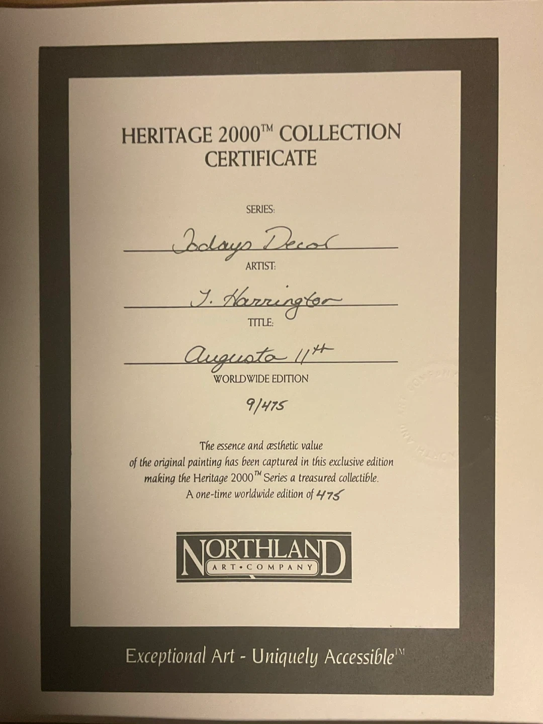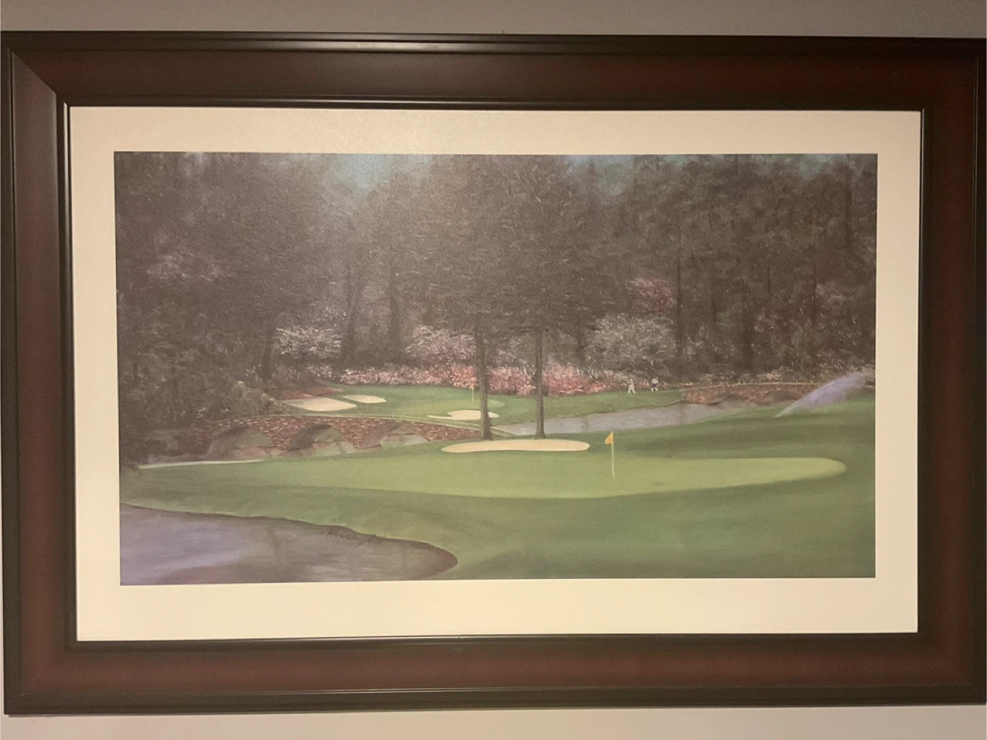 If you have a golf fan in the family or are a big Masters fan, this could be yours. This is a limited edition art print titled "Augusta 11th" by artist J. Harrington. It's part of the Heritage 2000 Collection from Northland Art Company. The worldwide edition is 9/475. Certificates included and also throwing in 2 other golf prints.