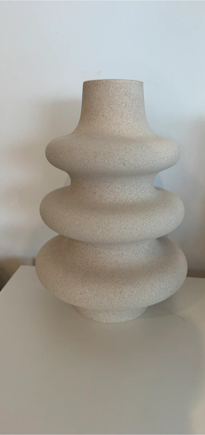 A stylish ceramic vase with a unique tiered, rounded design. It has a speckled matte finish in a neutral tone. Perfect for adding a modern touch to your decor.
