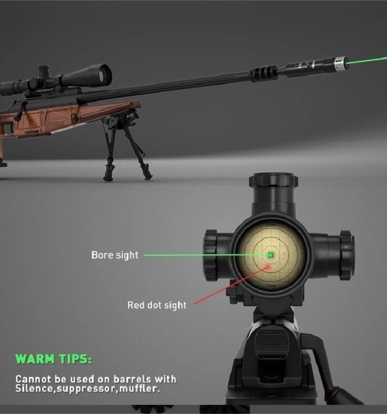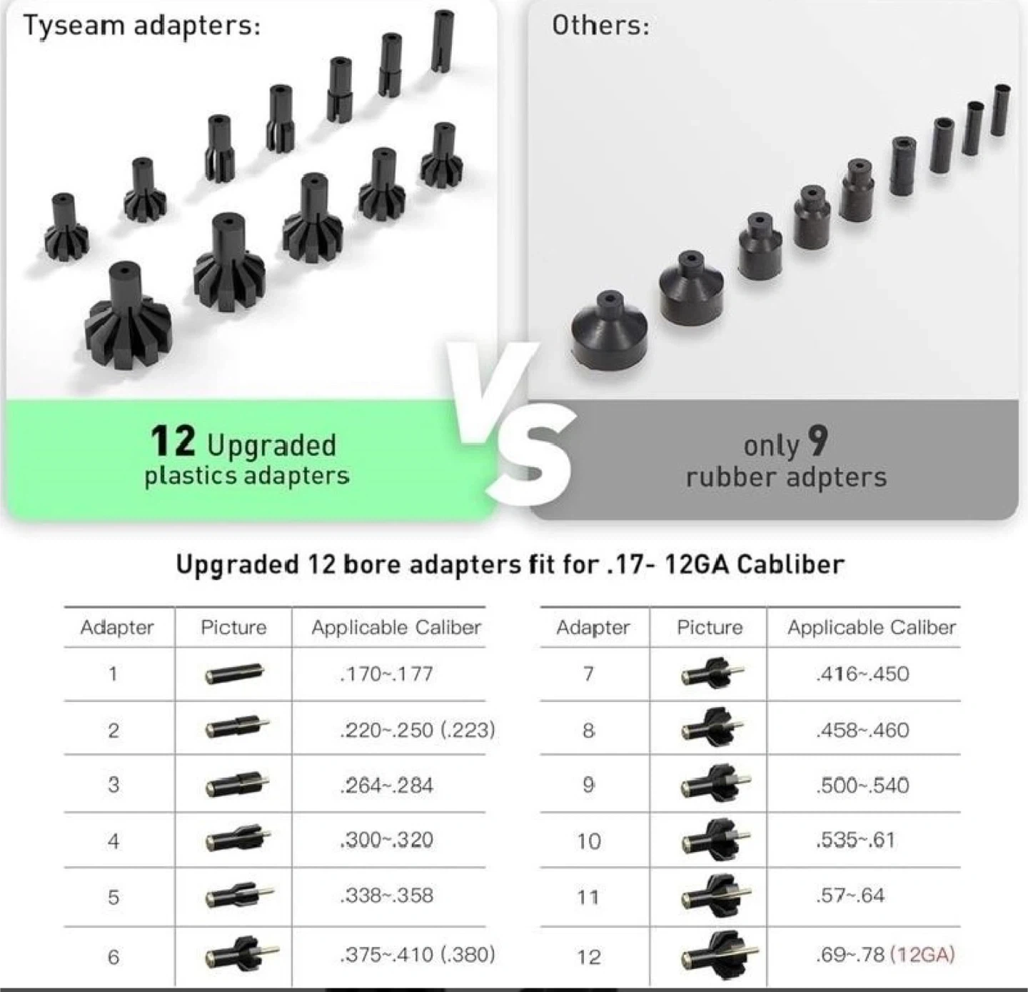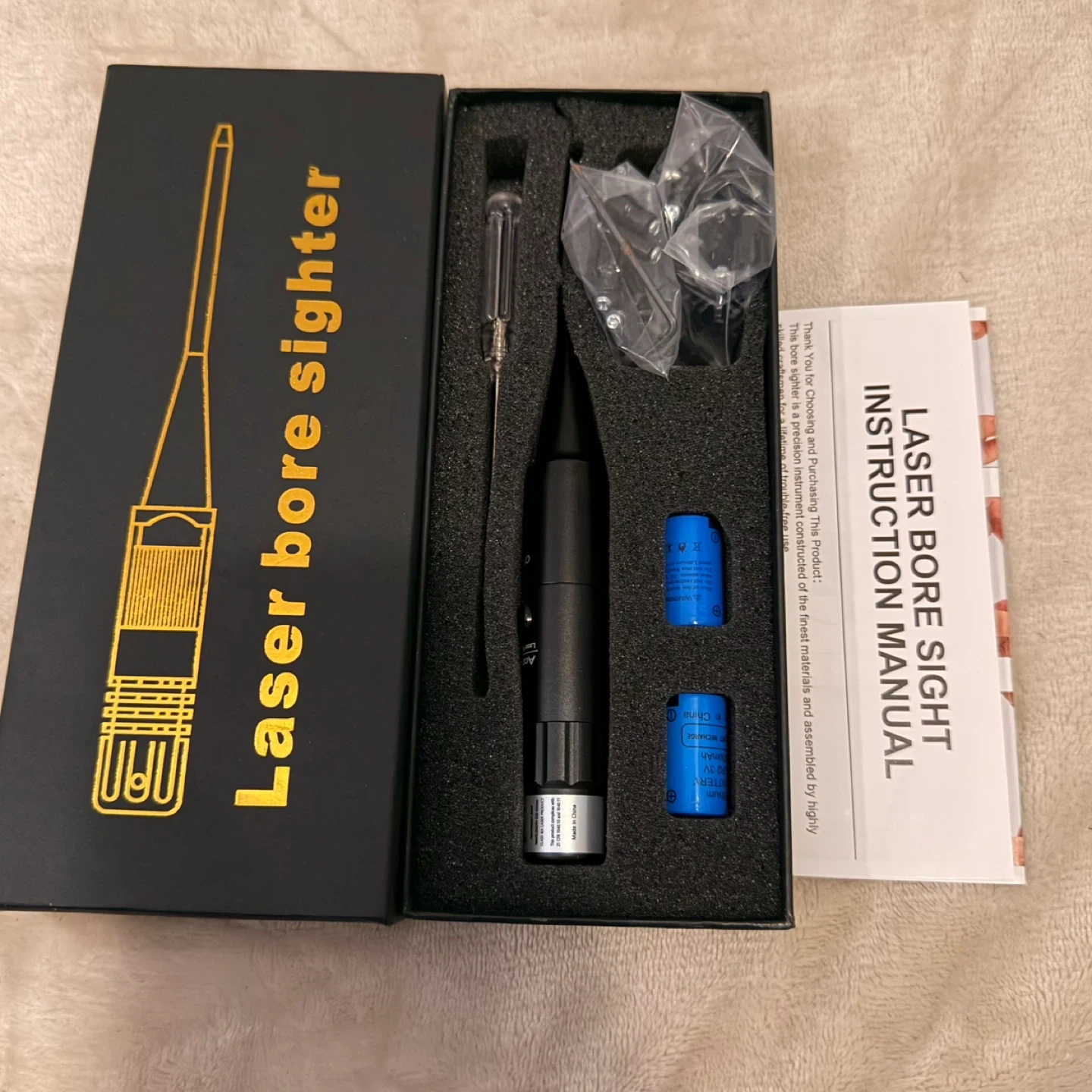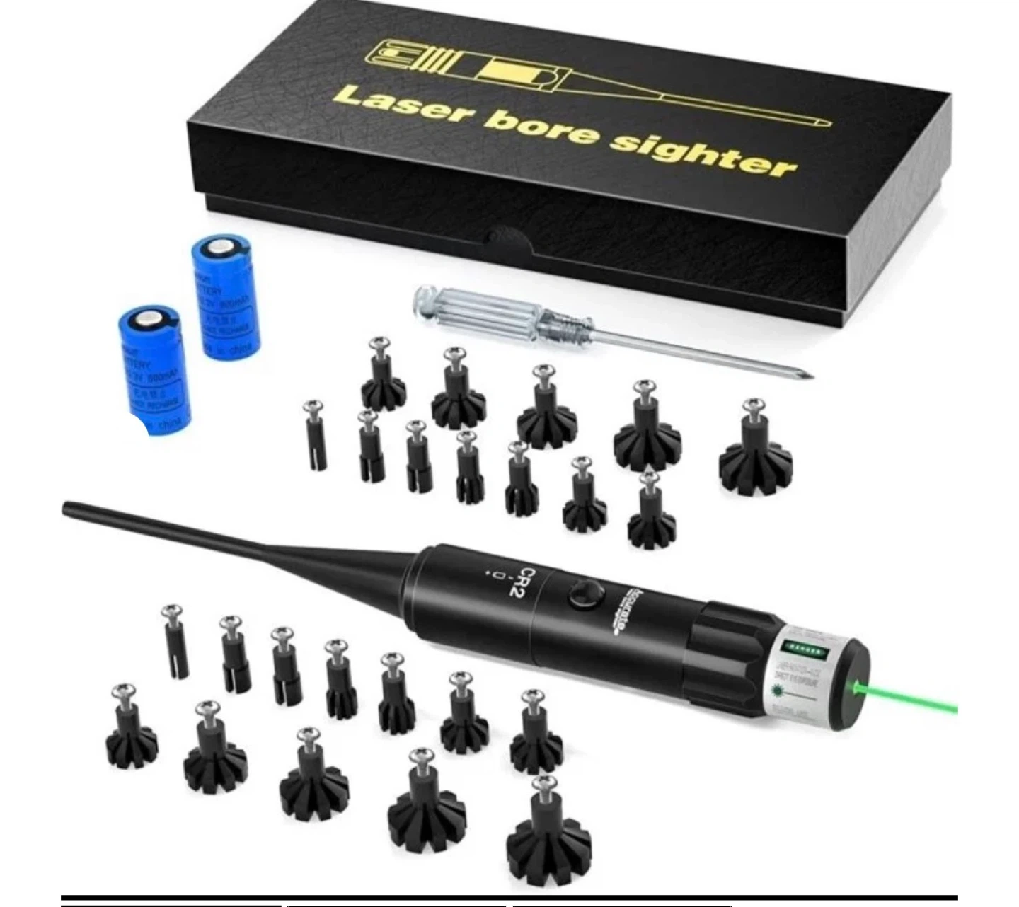 This laser bore sighter kit includes 12 upgraded plastic adapters for calibers .17 to 12GA. It also comes with a screwdriver and batteries. Perfect for zeroing your firearm's sights quickly and accurately. Cannot be used on barrels with silence, suppressor, or muffler.