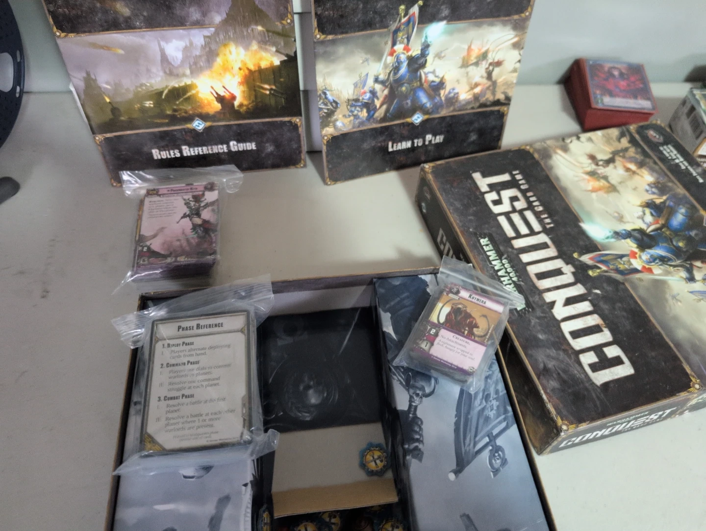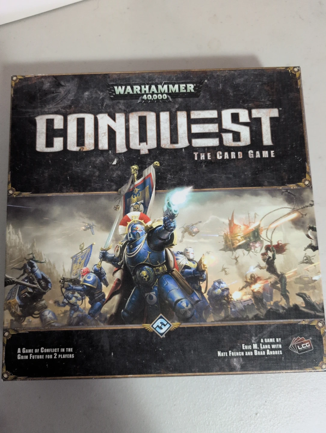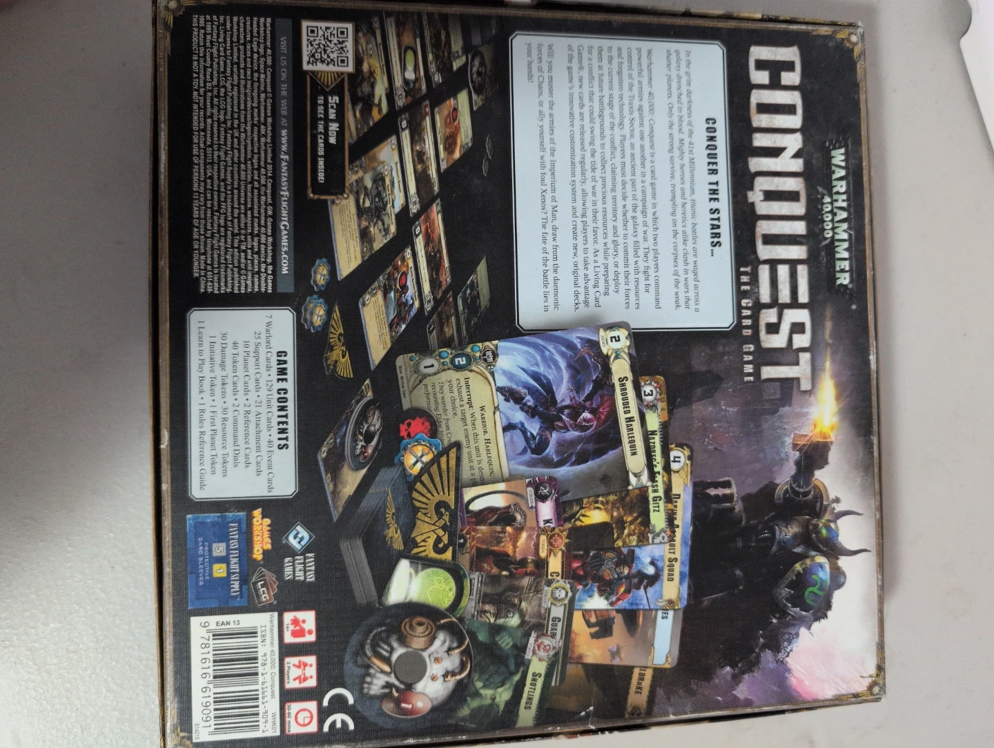 This is the Warhammer 40,000 Conquest card game, designed for 2 players. It includes the core game, rulebooks, and various support cards. Excellent for fans of strategic card battles!