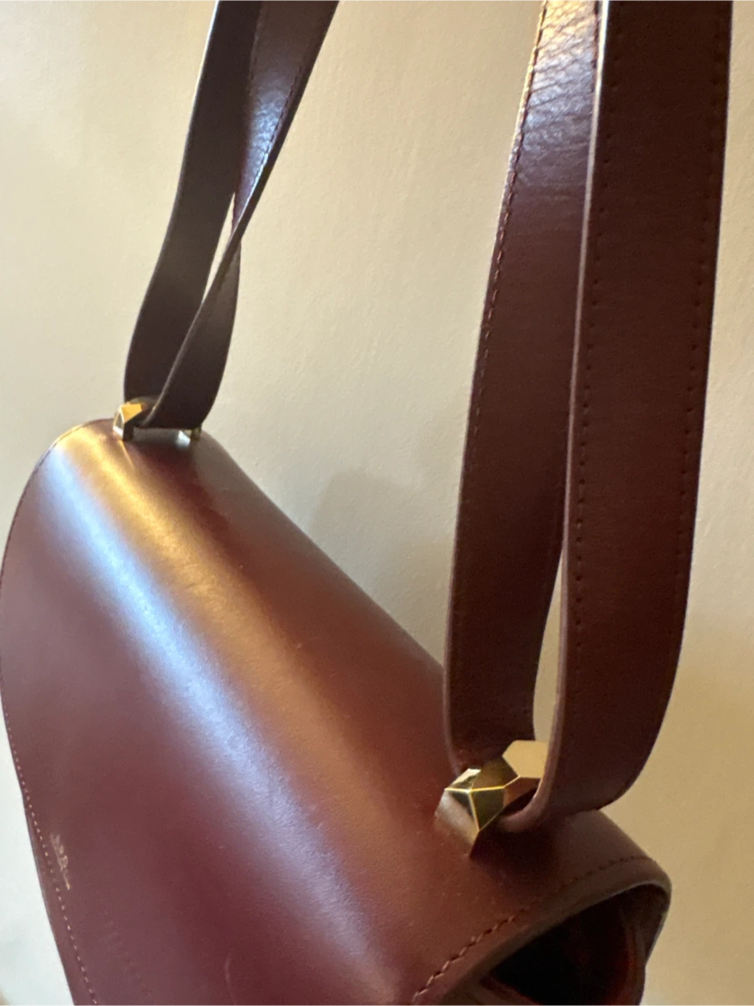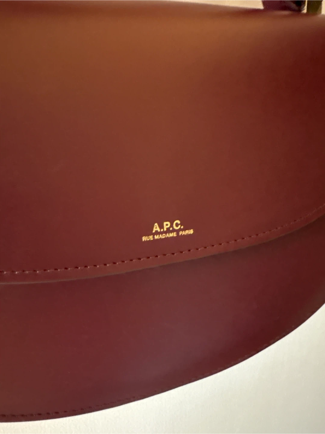 This is an A.P.C. shoulder bag in a deep burgundy colour. It's made from smooth leather with gold-tone hardware. The bag features a classic flap closure and an adjustable strap.
