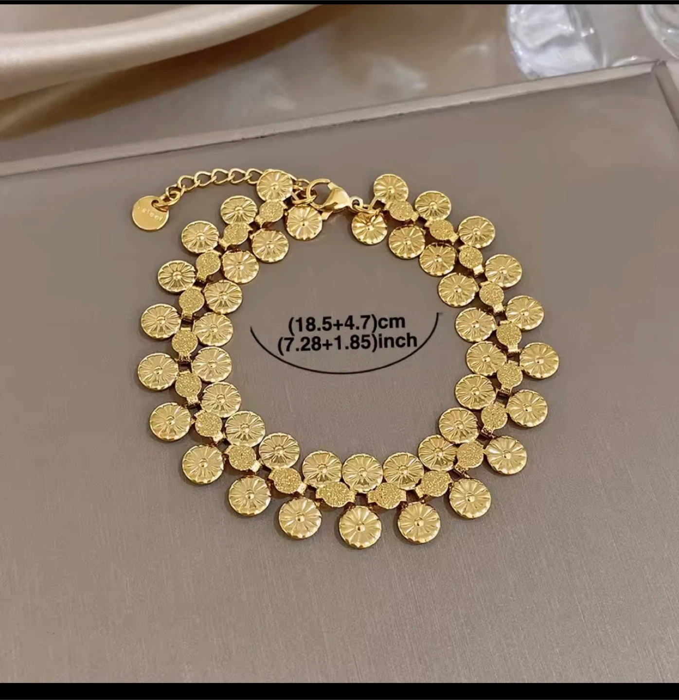 🚀A delicate gold tone bracelet with a floral link design. It measures 18.5+4.7cm (7.28+1.85) inches in length. This bracelet adds a touch of elegance to any outfit. Lazurd jewelry is your go‑to statement piece for a luxury look.