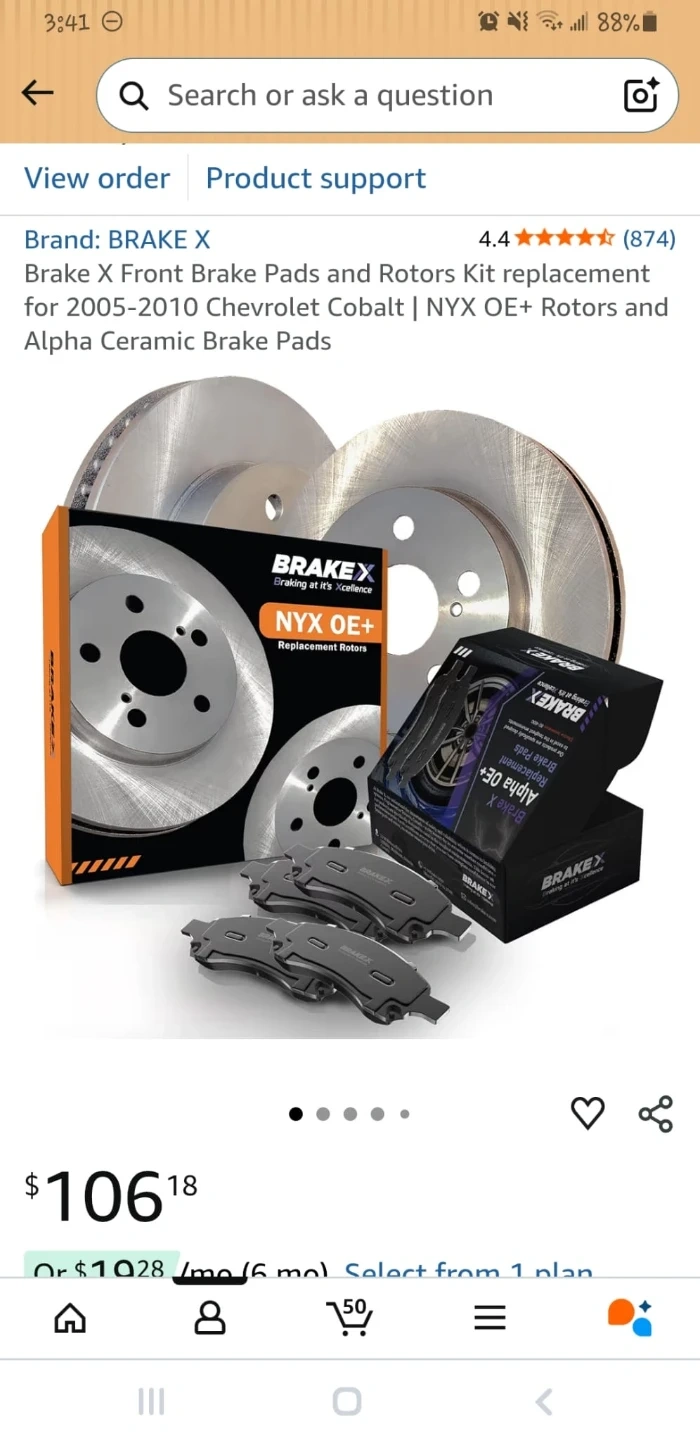 This is a Brake X Front Brake Pads and Rotors Kit. It's designed as a replacement for 2005-2010 Chevrolet Cobalt models. The kit includes NYX OE+ Rotors and Alpha Ceramic Brake Pads.