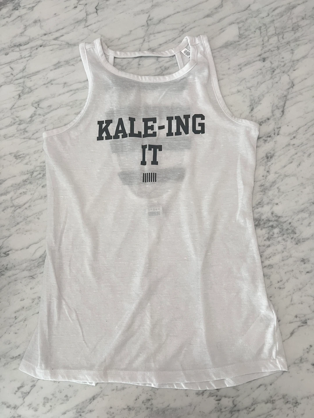 White tank top from Victoria's Secret VSX Sport line. Features a graphic 'KALE-ING IT' print on the front and a strappy cutout detail on the back. Lightweight and breathable fabric.