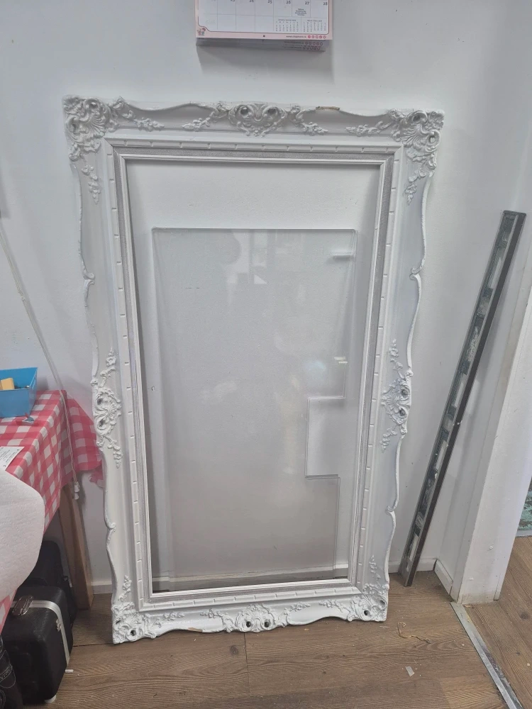 This is a decorative white frame with ornate detailing. Perfect for adding a vintage touch to your decor! Great for event decor