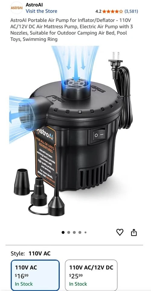 AstroAI Air Pump - 110V/12V Air Mattress Pump, w/3 nozzles