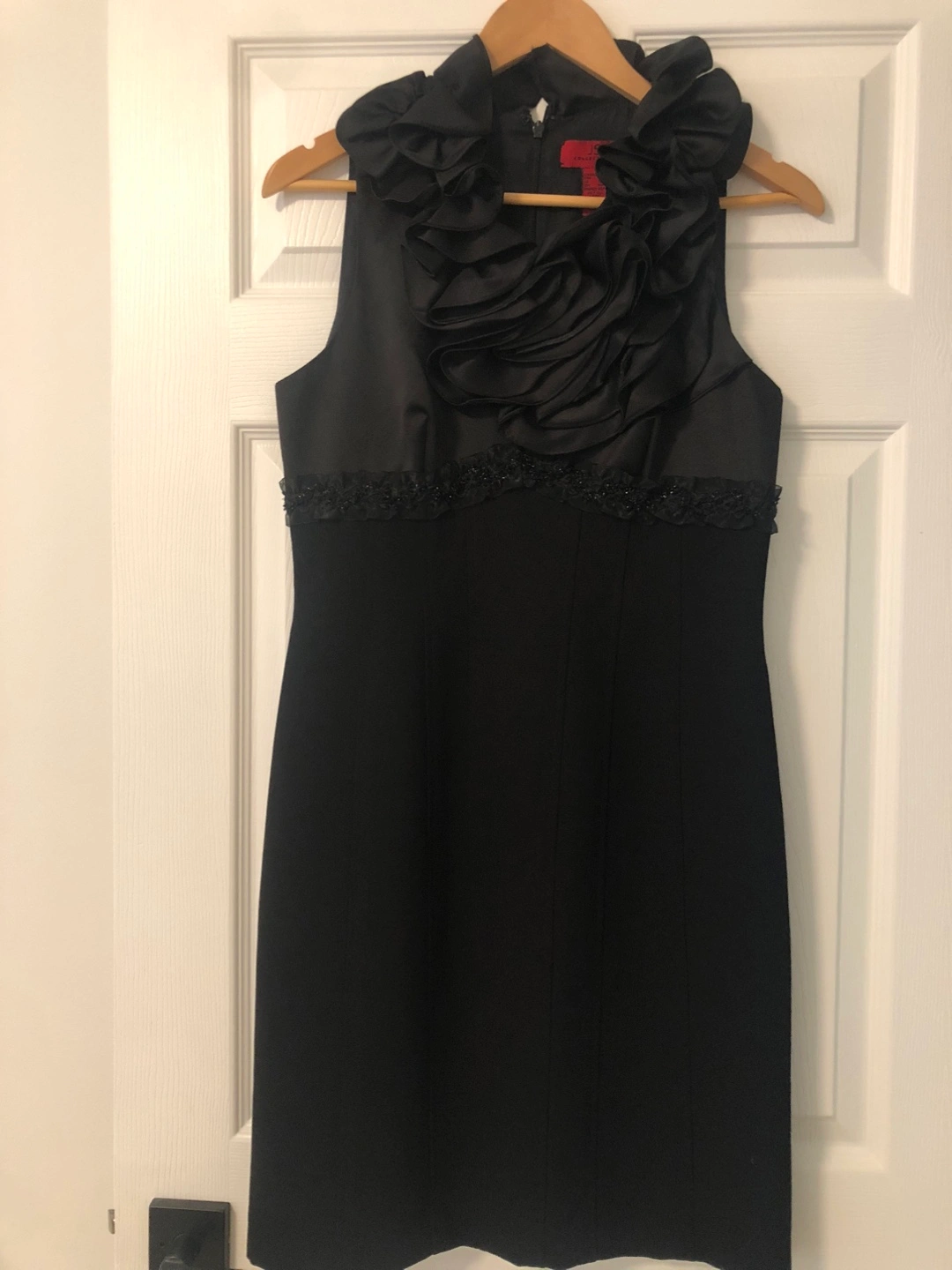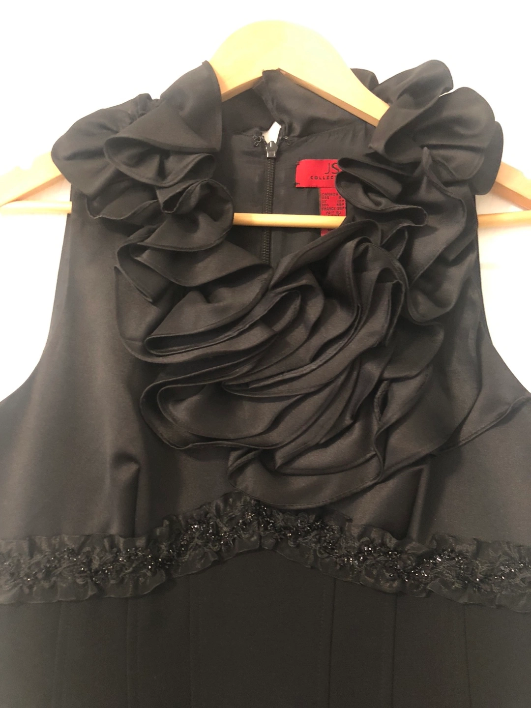 This is a beautiful black dress from JS Collections! It features a unique ruffle design around the neckline and beaded detailing at the waist. Perfect for a special occasion or a night out
