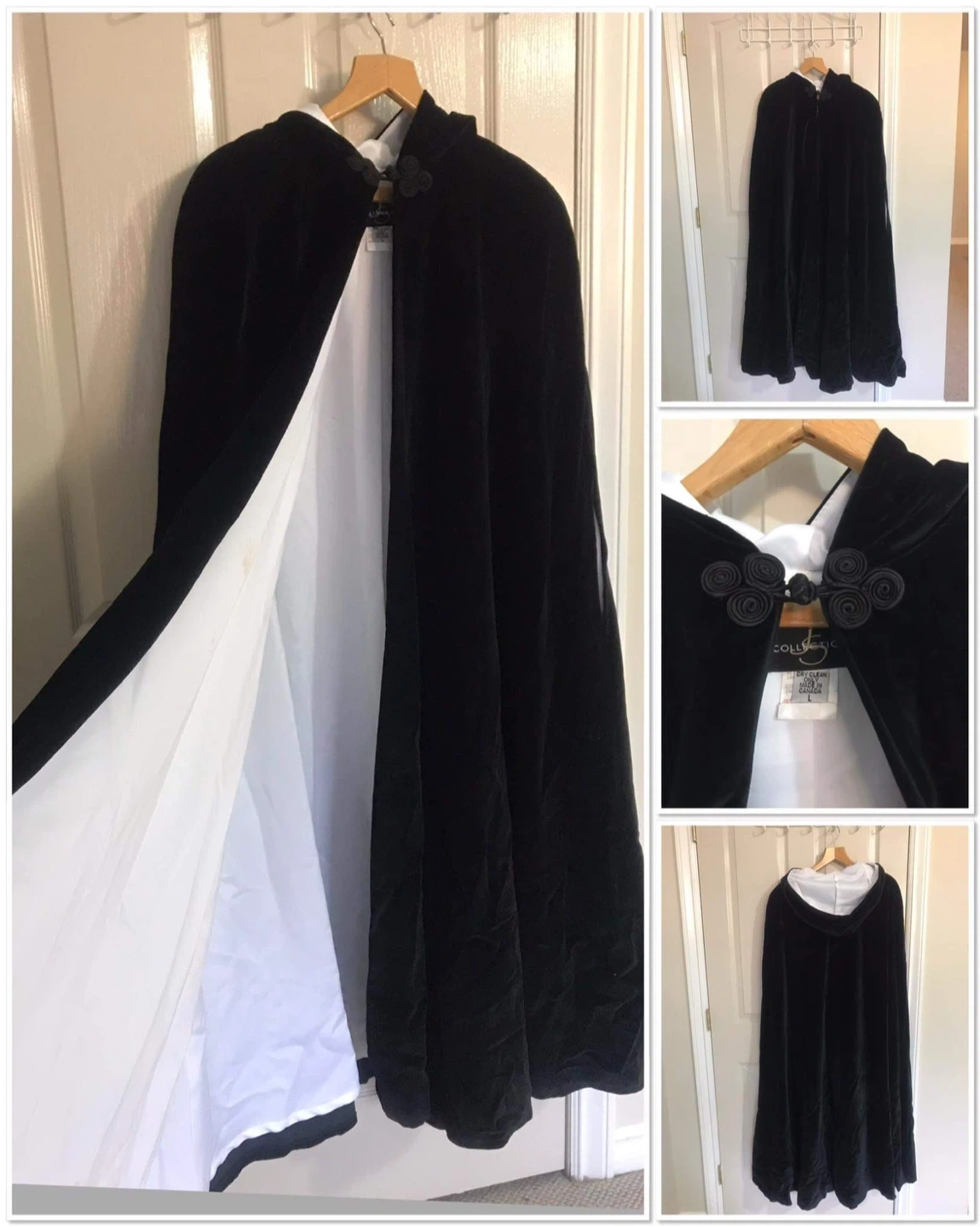 15Selling a beautiful black velvet cape from JS Collections! It's a size L and made in Canada. The cape is made of 100% cotton with a 100% polyester lining. It features a unique floral closure at the neck. Dry clean only