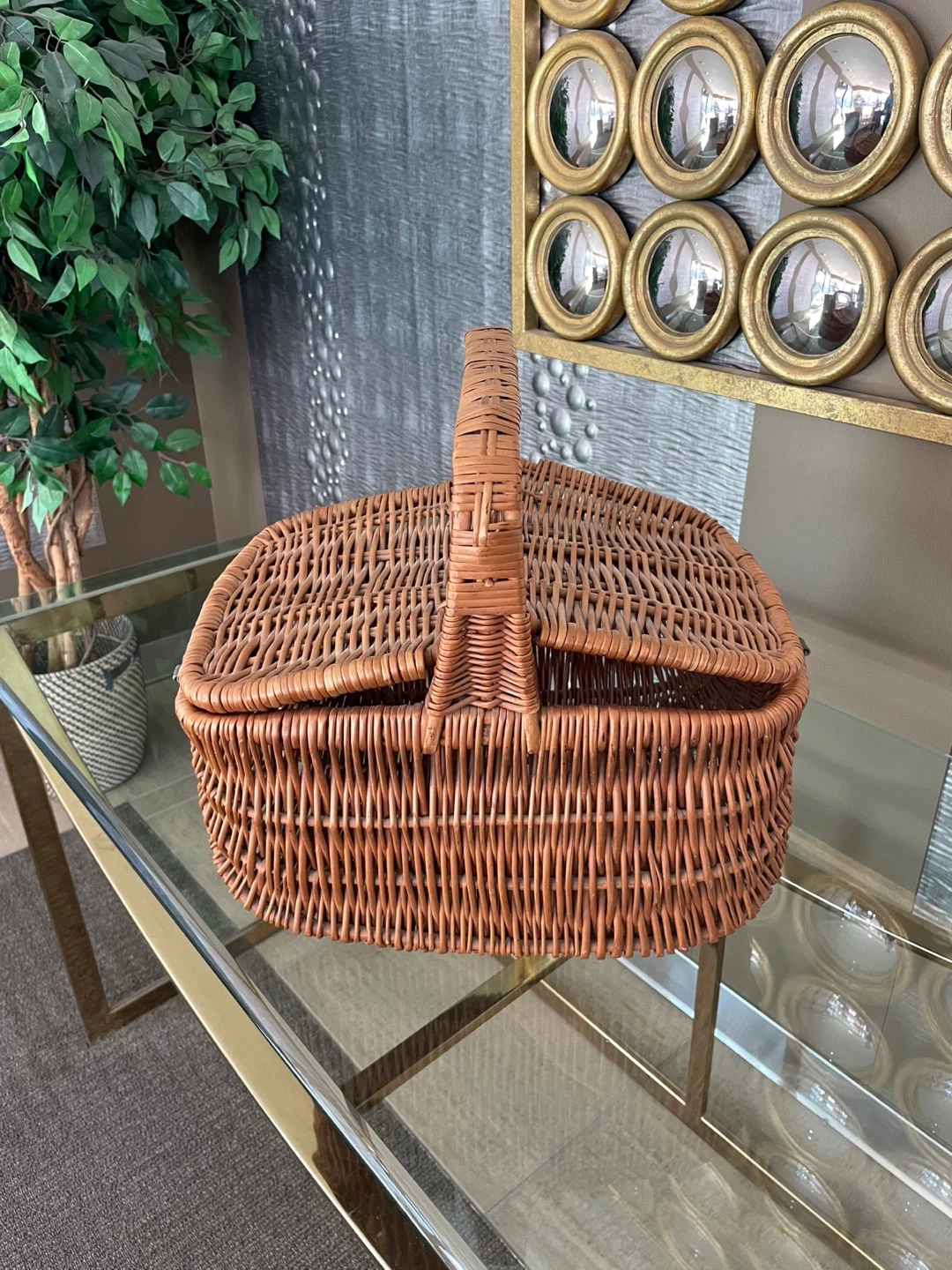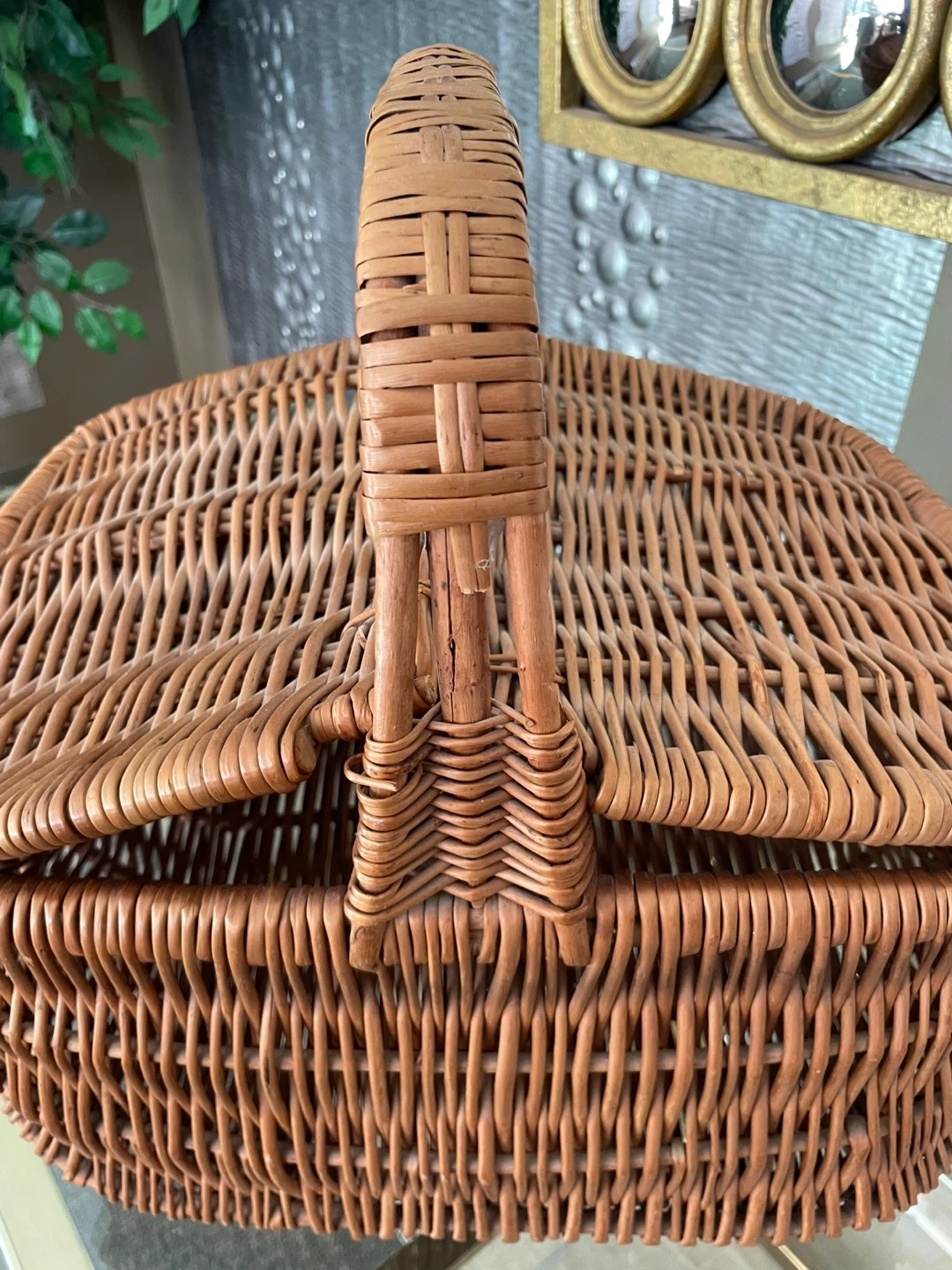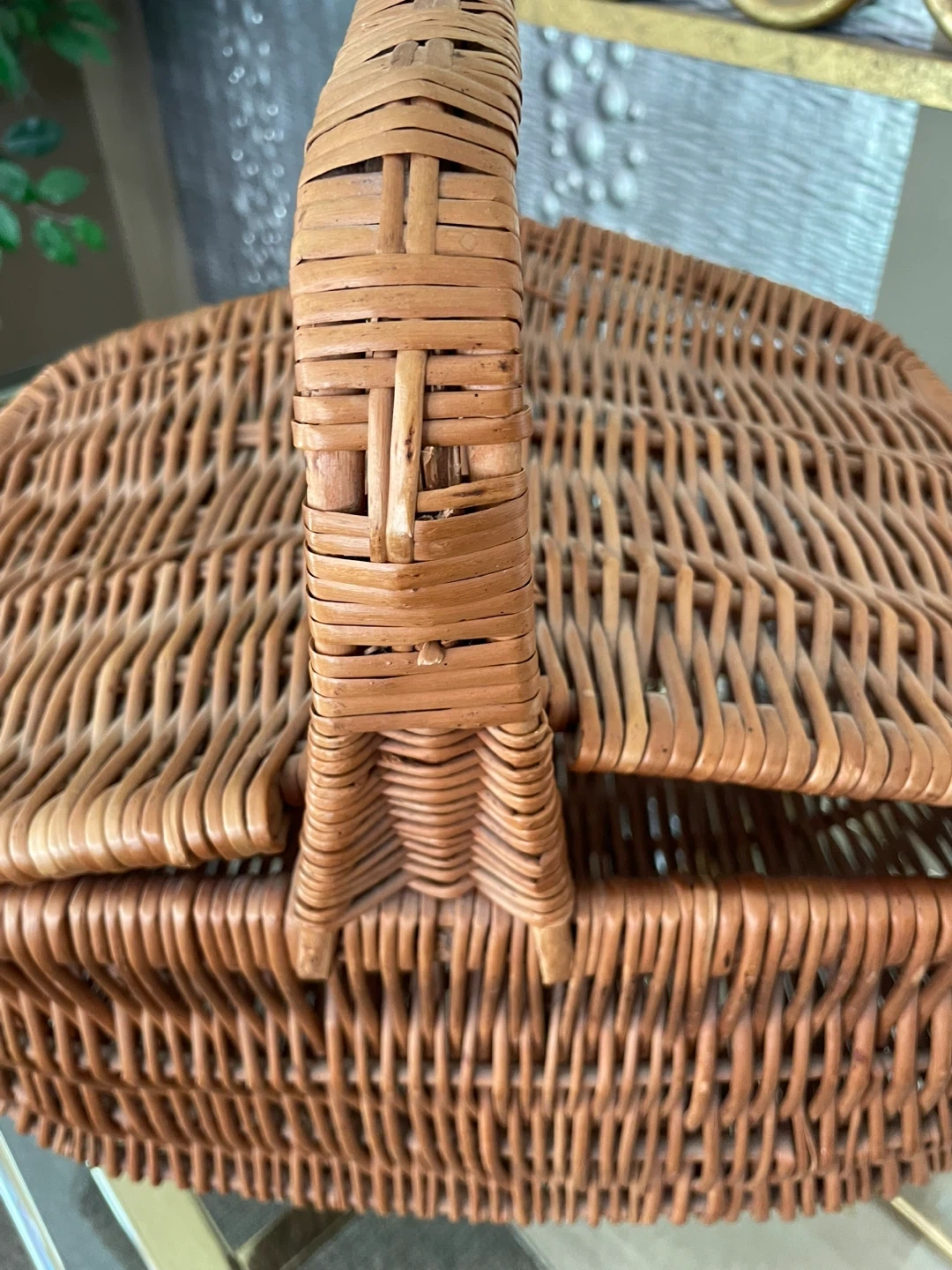 In very good vintage condition. There is a bit of the weave missing on the handle wrap but the basket , handle and lid is perfect.