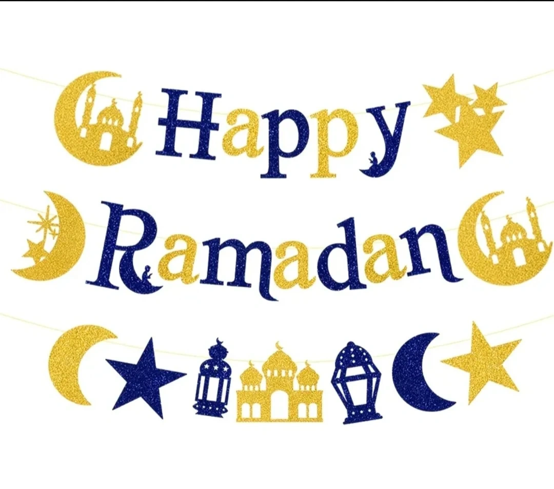 This banner set is perfect for celebrating Ramadan! It features glittery blue and gold lettering spelling out "Happy Ramadan" along with crescent moons, stars, mosques, and lanterns. It's a festive addition to your home decor for the holy month.