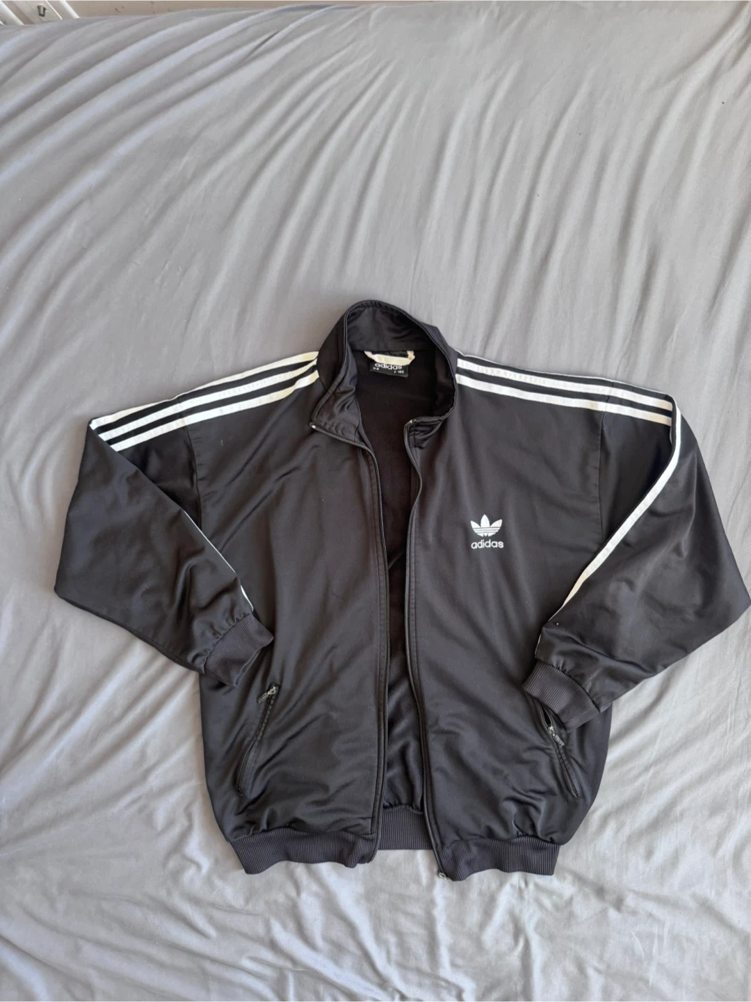 This is a black Adidas track jacket with white stripes on the sleeves. It has a full zip closure and two zippered pockets. A classic piece for everyday wear!