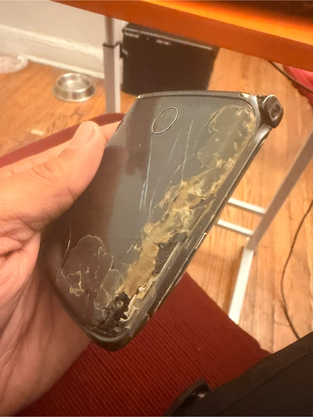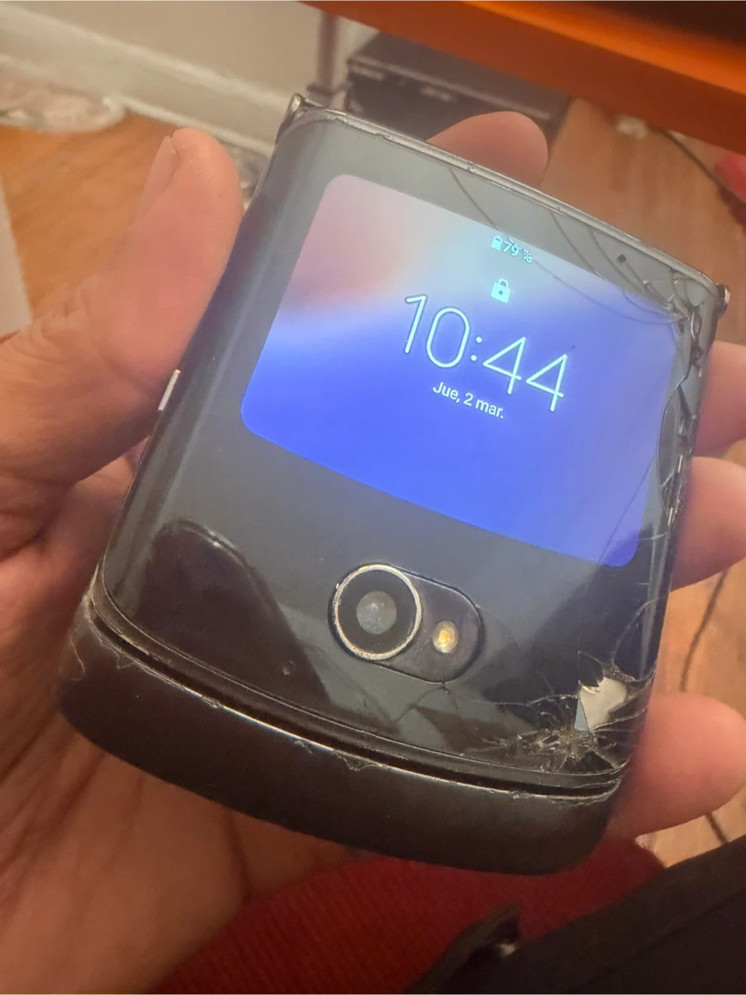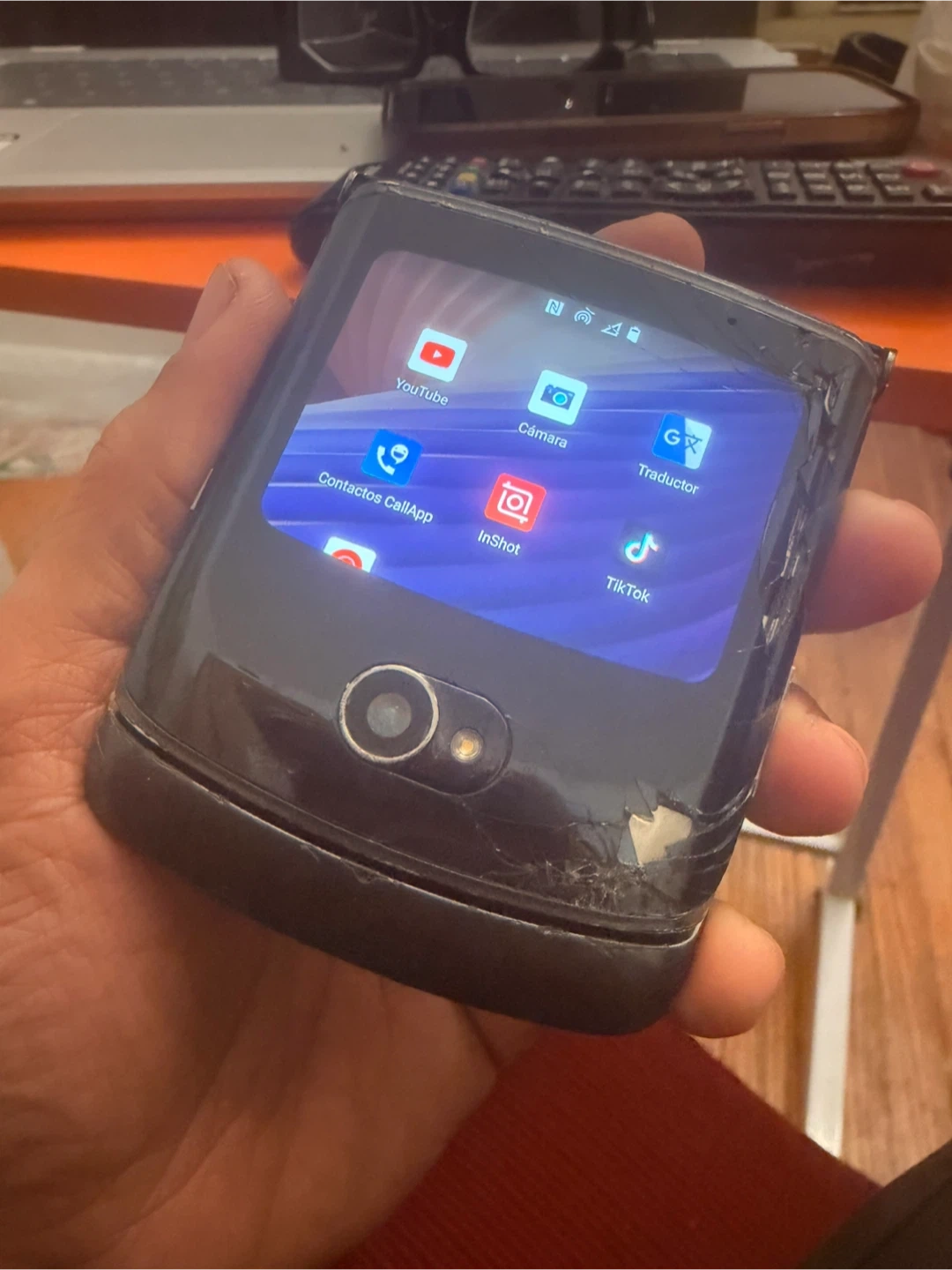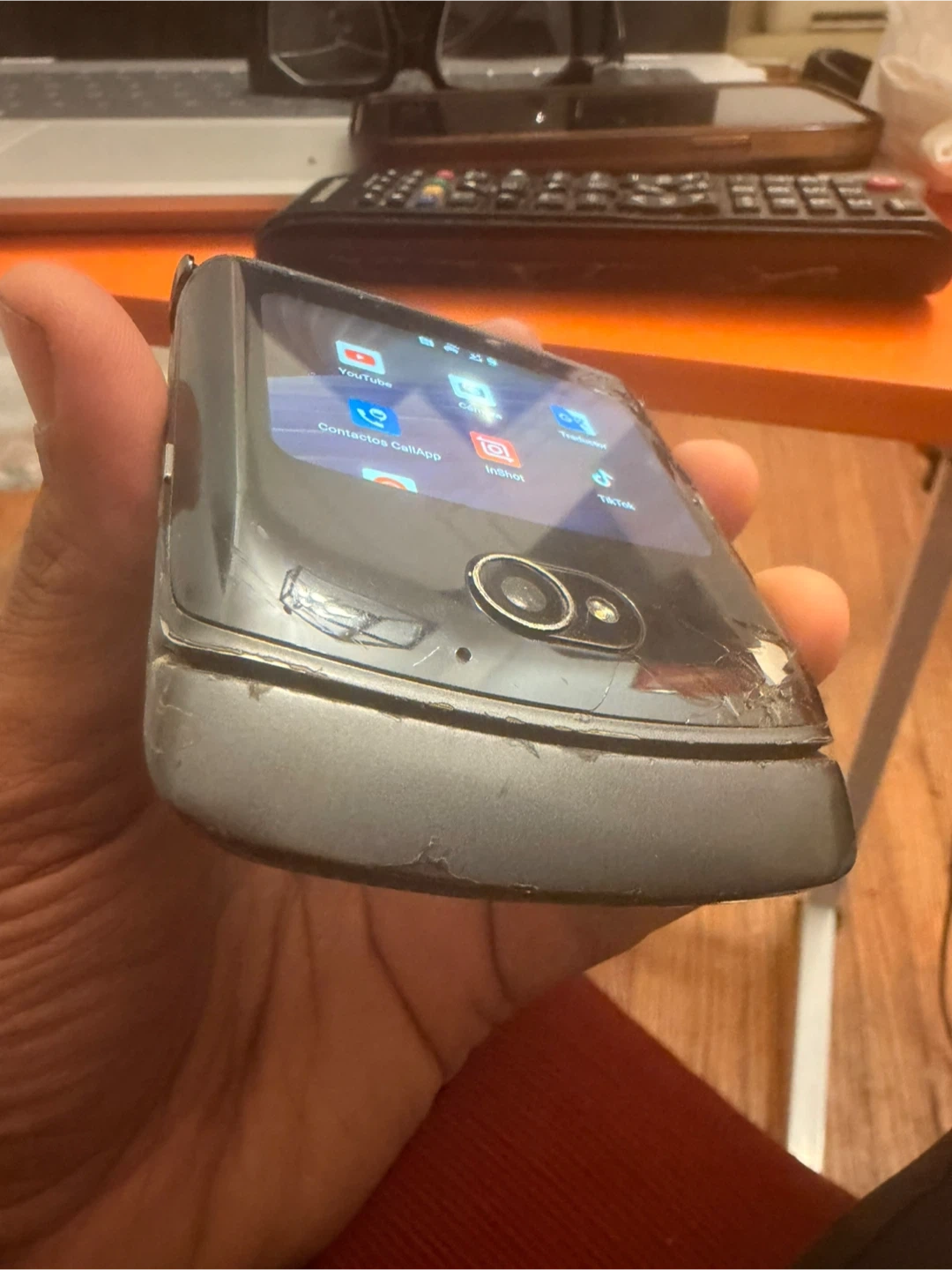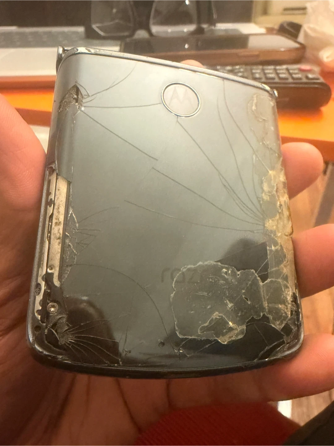 This is a used Motorola RAZR V3 cell phone. It appears to be damaged and is being sold for parts or repair. The outer casing is cracked and peeling in several areas. The screen is also cracked.