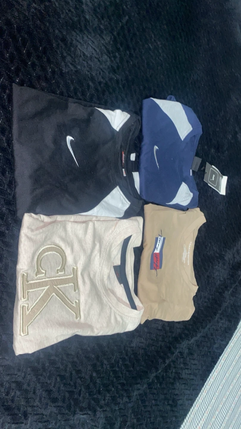 Includes two Nike t-shirts, one Calvin Klein t-shirt, and one Tommy Hilfiger t-shirt. Brands and logos are clearly visible on each shirt. Mix of colors including black, navy, beige, and a brown.Age:4,5,6 depend on kids growth each T-shirt is $5 all 3 $15