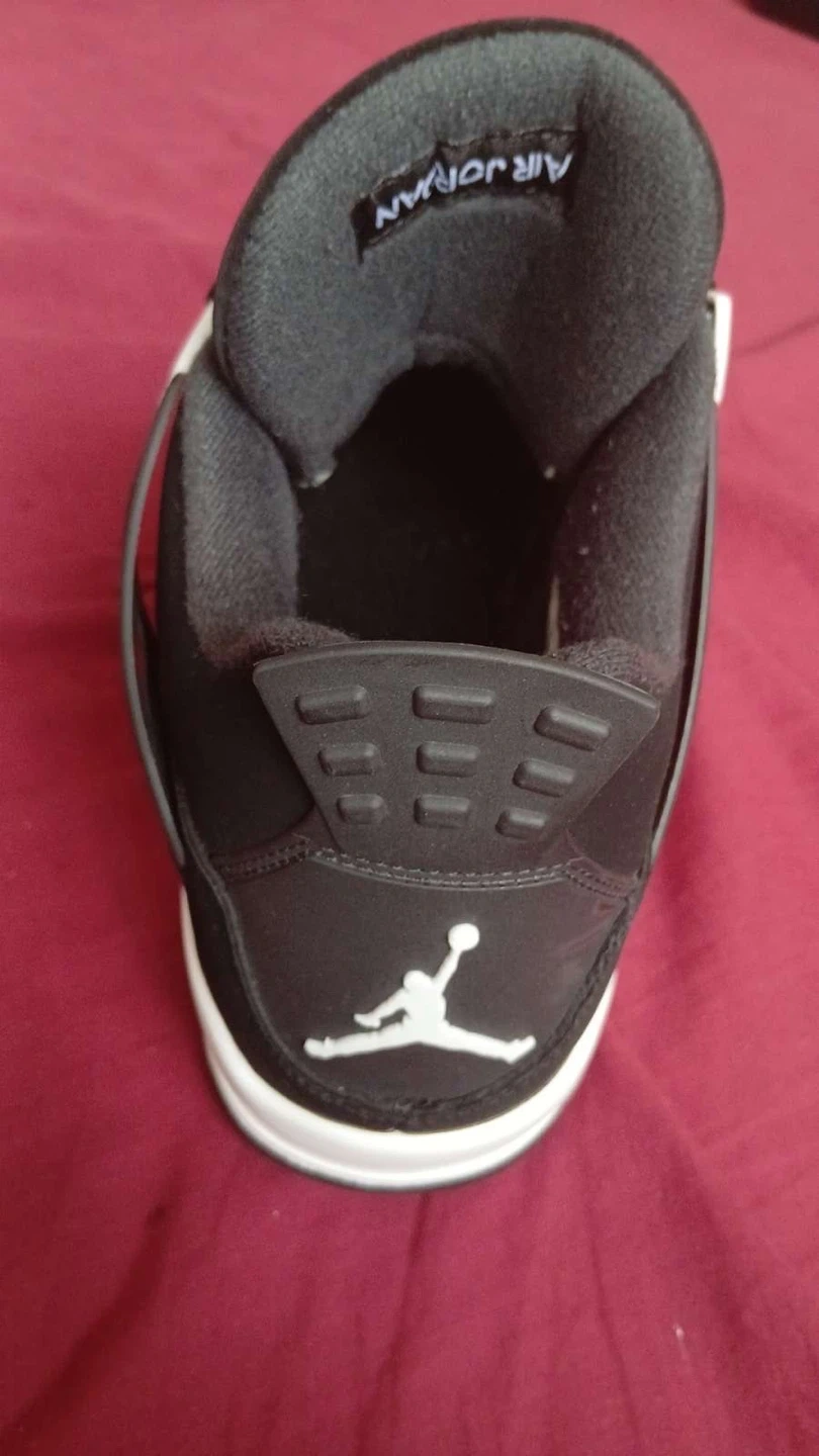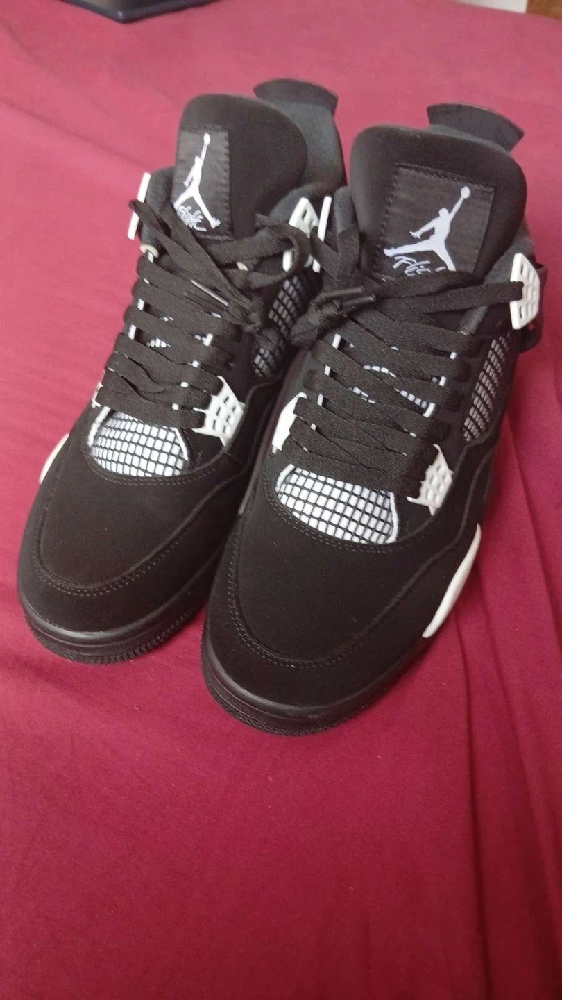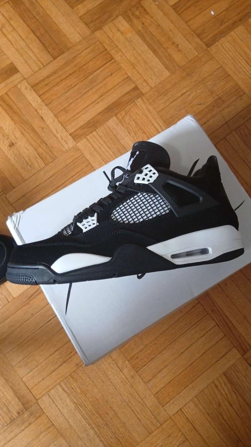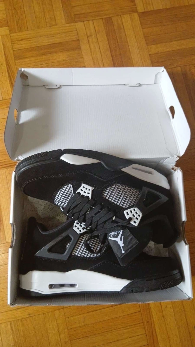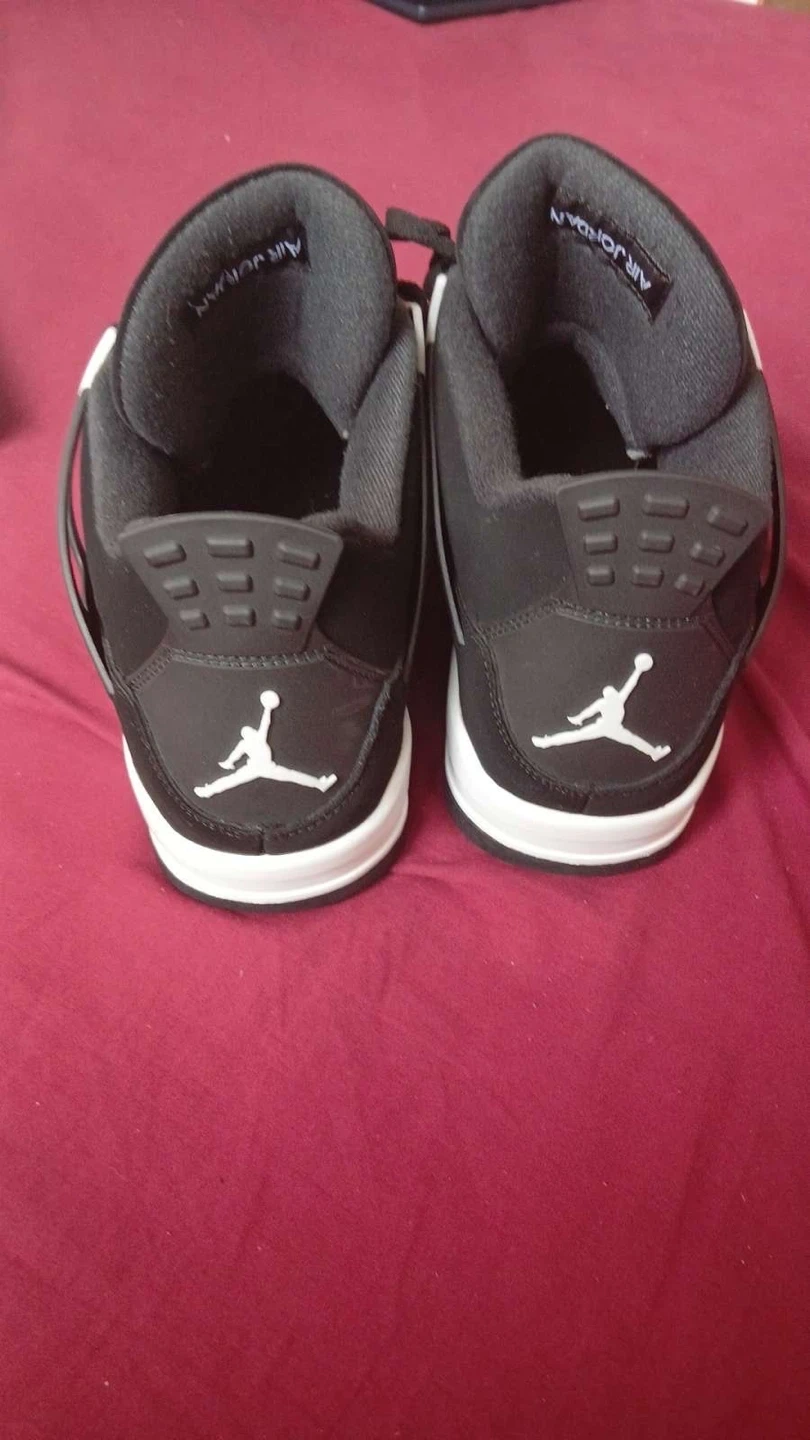 These Air Jordan 4 Retro sneakers are black with white accents. They come in their original box. Perfect for casual wear or basketball!