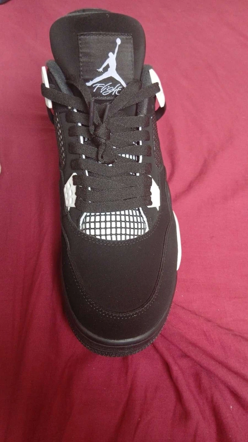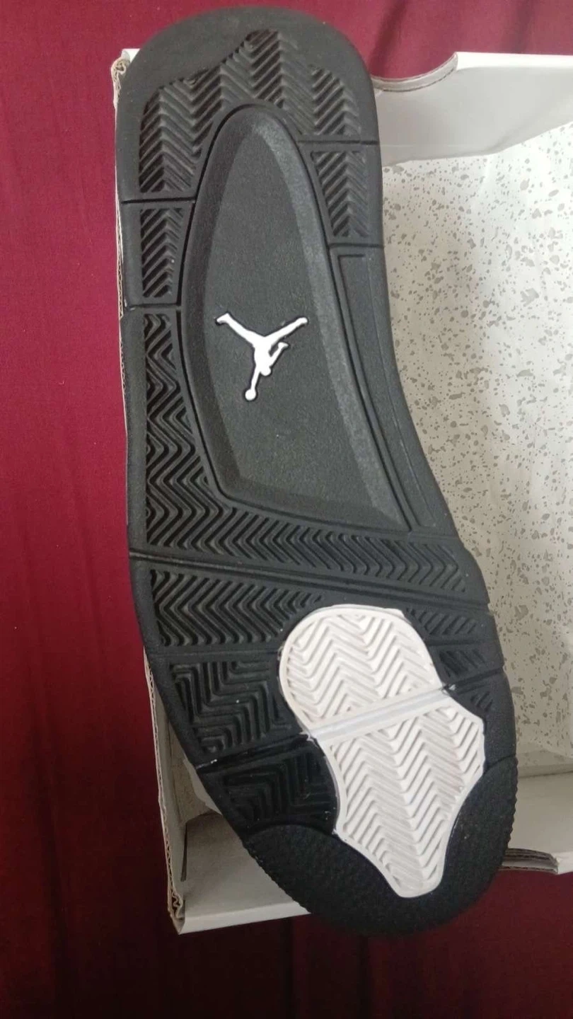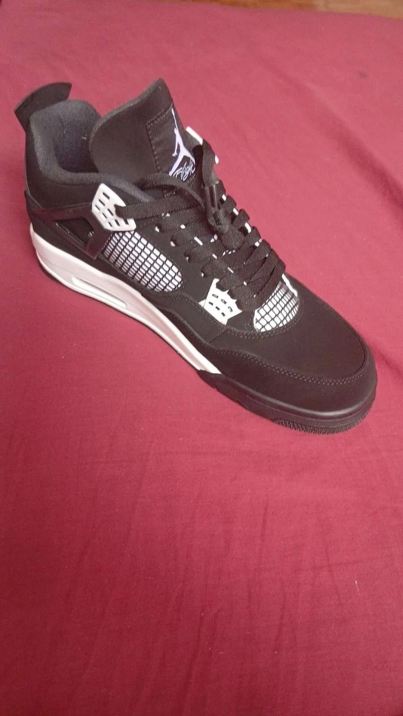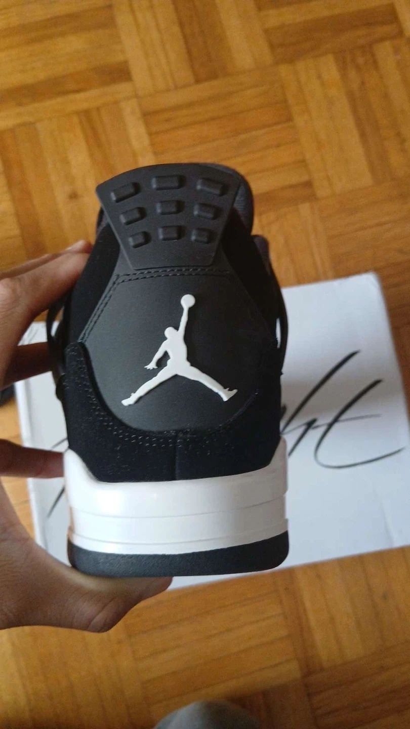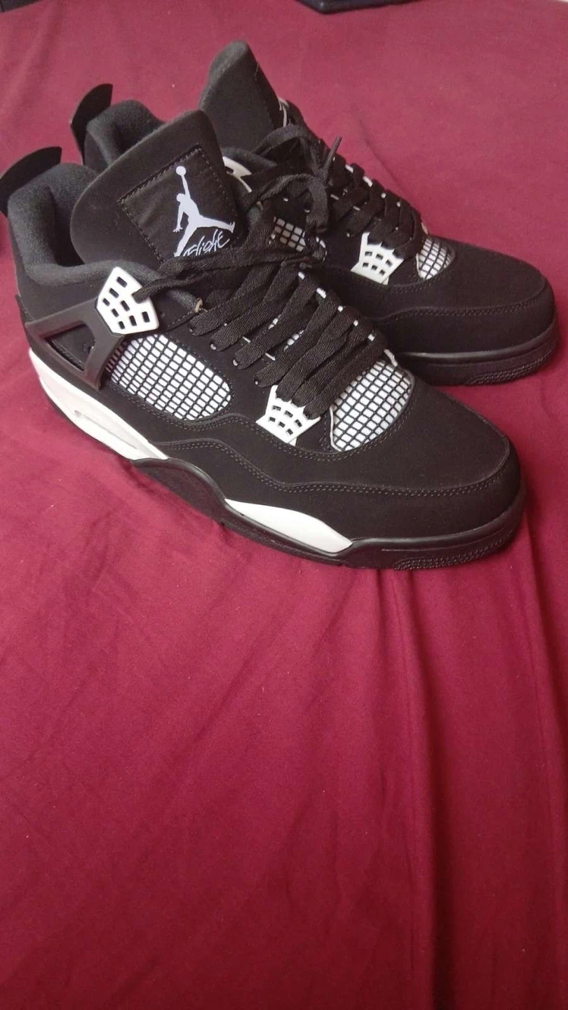 These Air Jordan 4 Retro sneakers are black with white accents. They come in their original box. Perfect for casual wear or basketball!