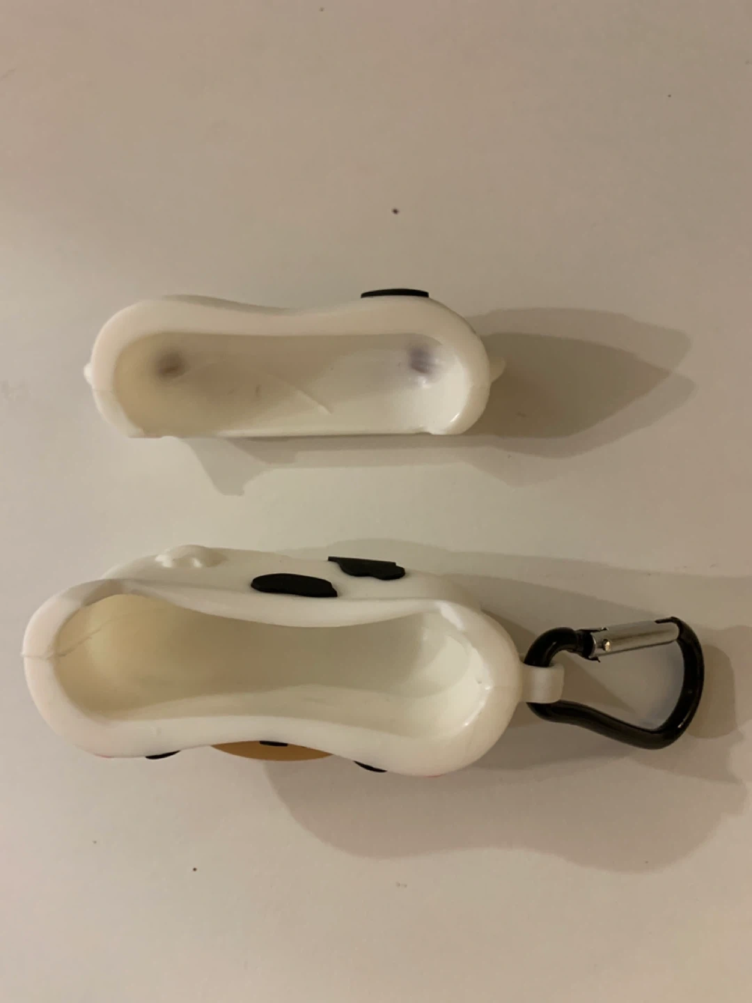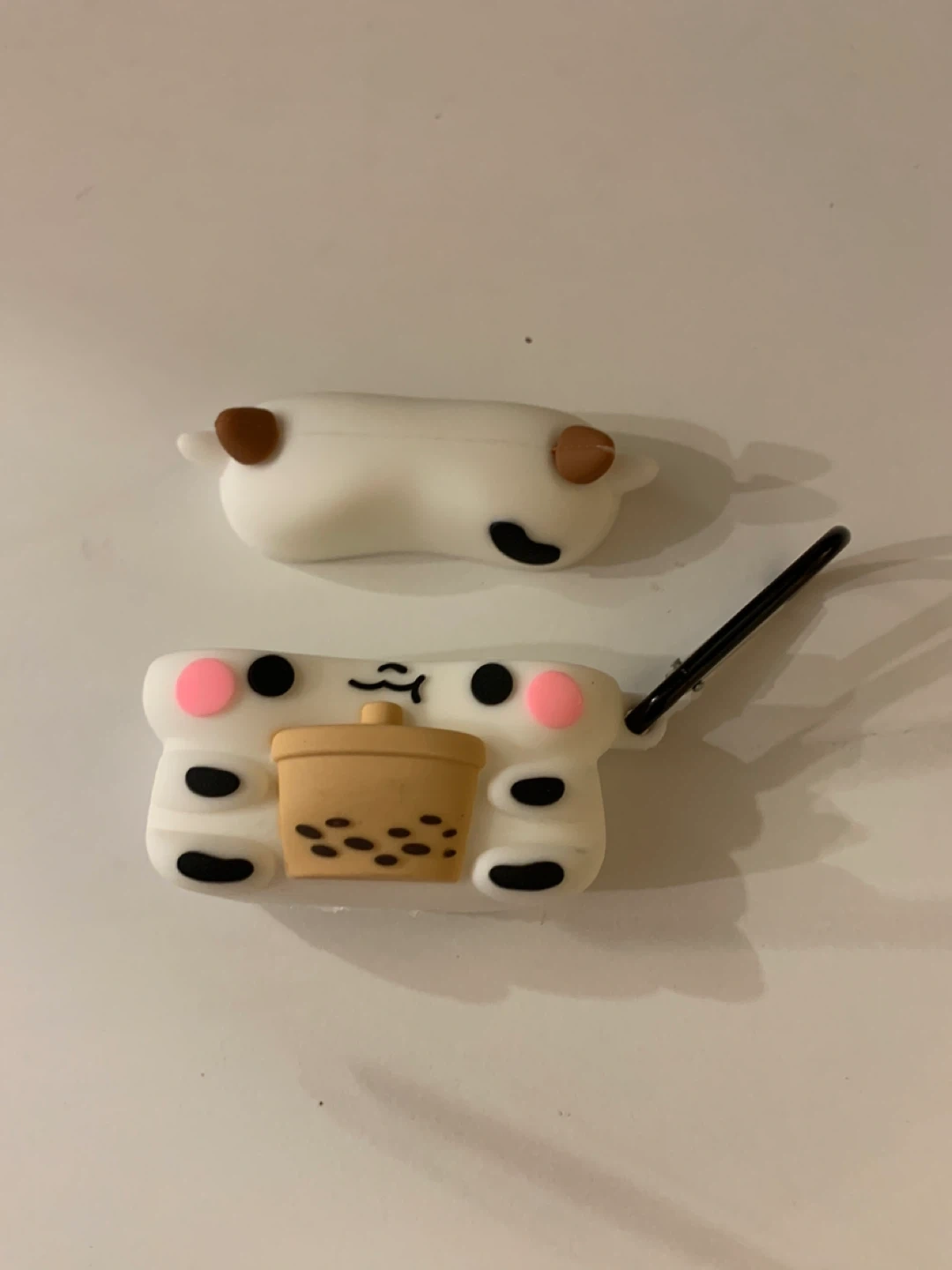 This is a silicone case designed for AirPods, featuring a cute boba tea design. It comes with a carabiner for easy attachment. Protects your AirPods from scratches and minor drops!