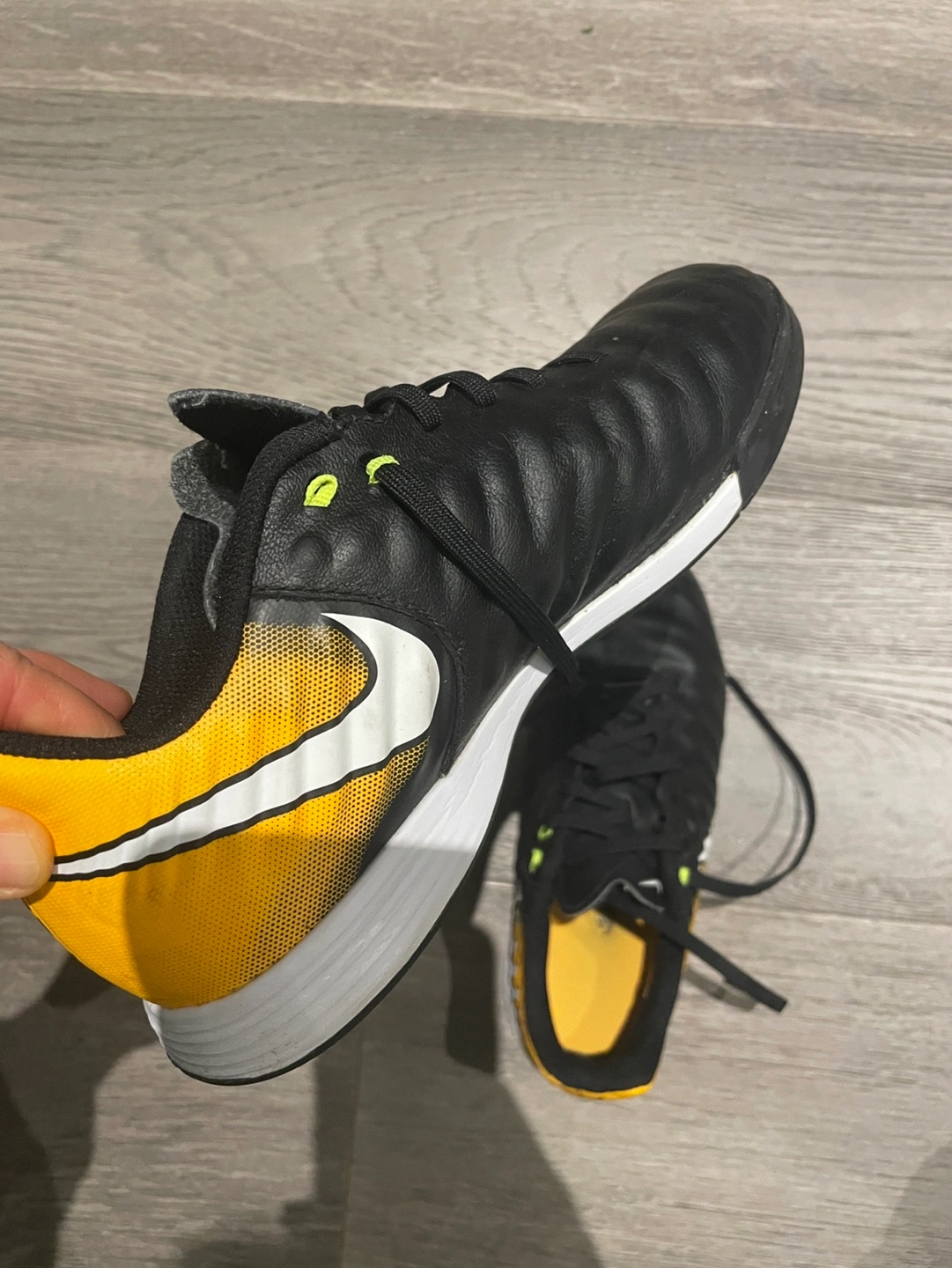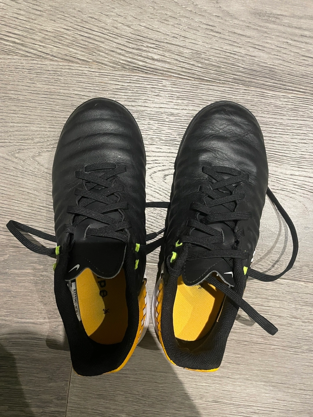 Black and yellow leather indoor soccer shoes. Excellent condition.