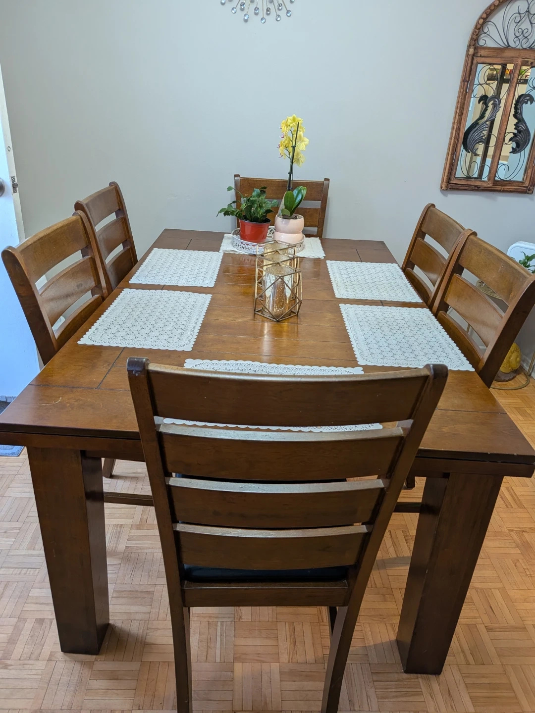 A classi c solid wooden dining table that seats 8 people. It's made of durable wood and comes with 8 matching chairs. This set is perfect for family dinners or gatherings!