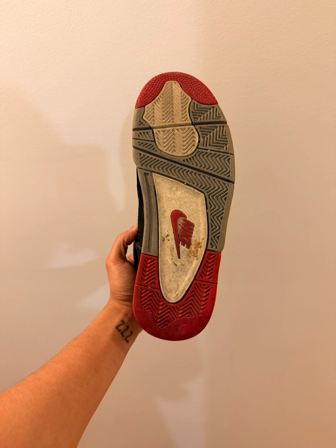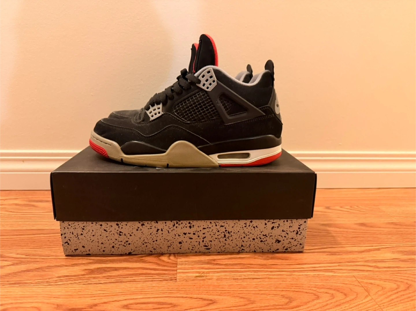 A pair of Air Jordan 4 "Bred" sneakers in black and red. These shoes feature a nubuck upper and rubber sole. Comes with the original box.