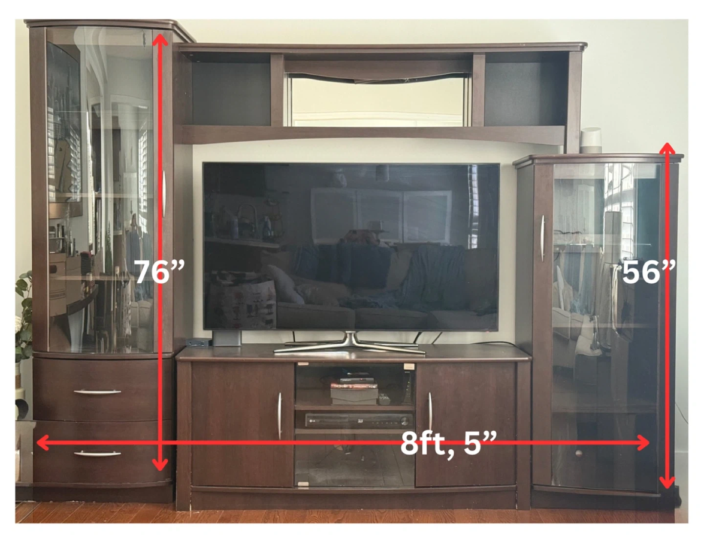 Spacious entertainment unit in a dark wood finish. Features two glass display cabinets on either side with internal shelving. The central section includes drawers and shelves for media components. Total width is 8ft, 5". Overall height of side cabinets is 76" and 56". Central TV opening is 56" wide and 34.5" high. Selling as is