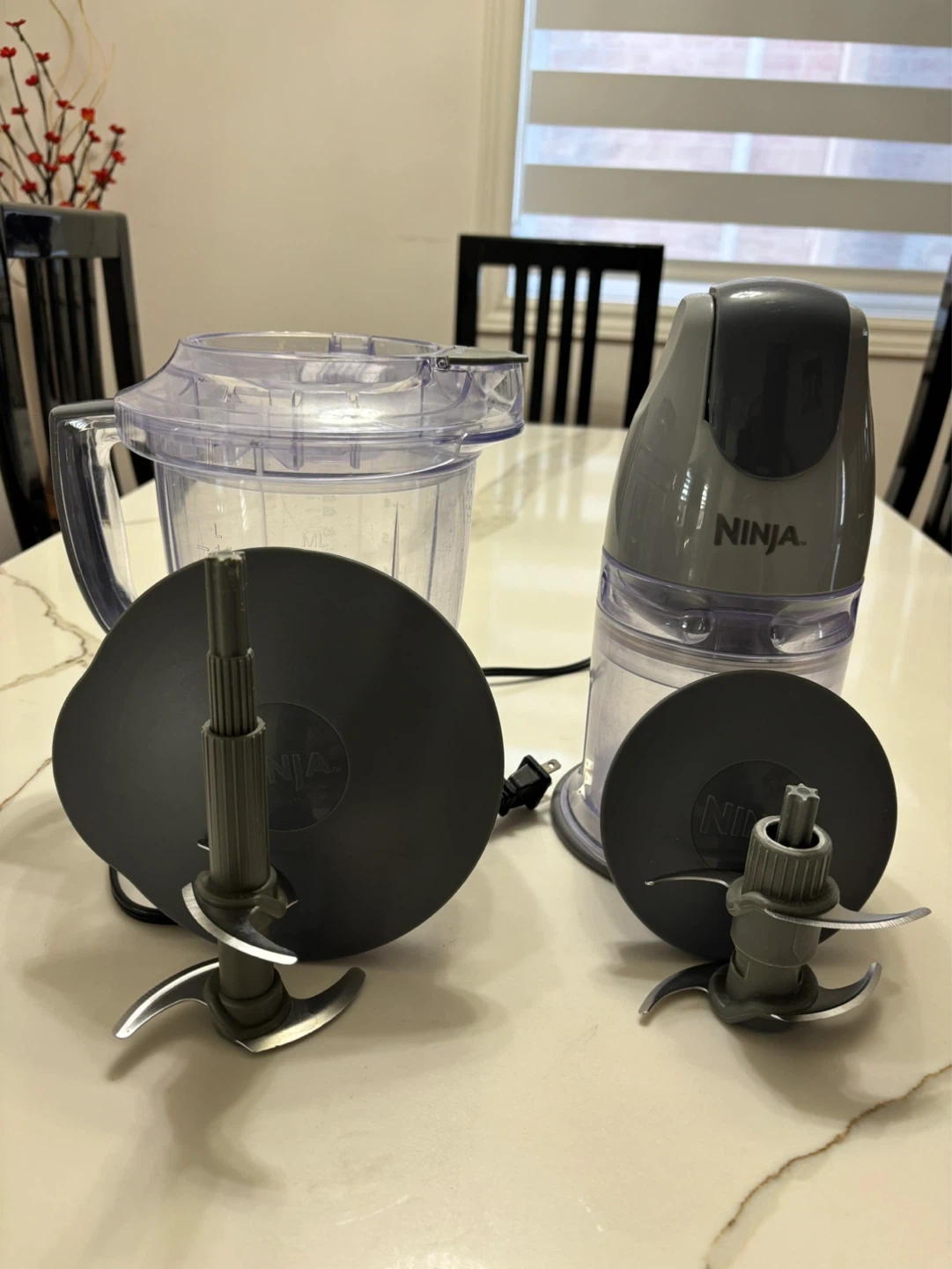 This Ninja food processor and chopper set includes a large pitcher and a smaller chopper cup. Both units have sharp blade attachments. Great for chopping vegetables or making sauces! From a pet free, vegetarian home!