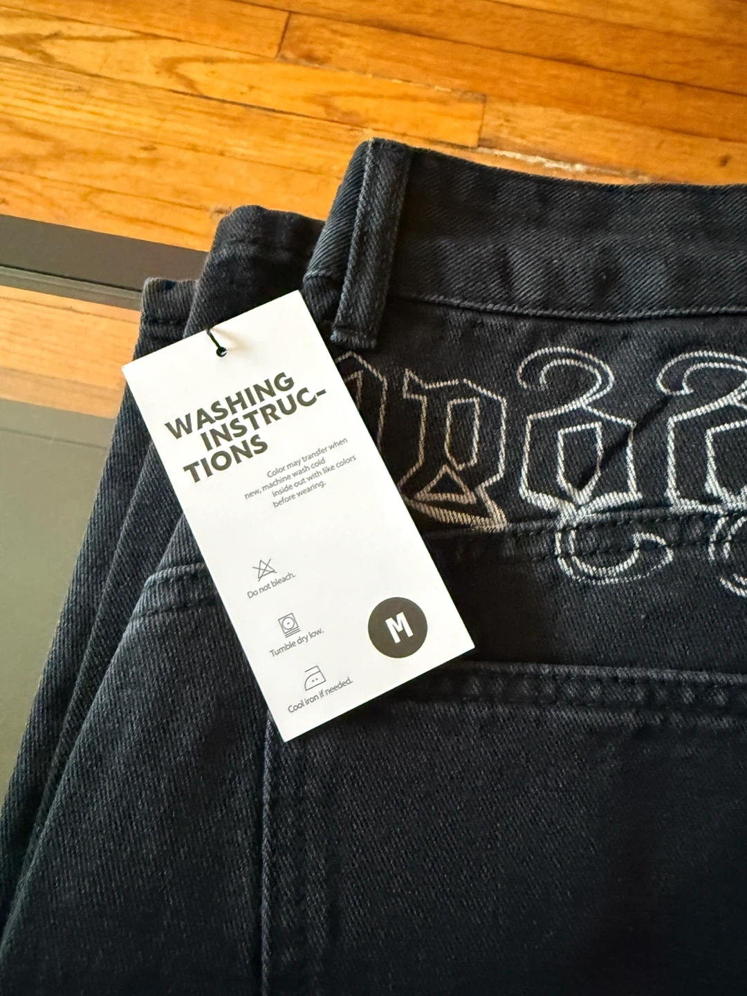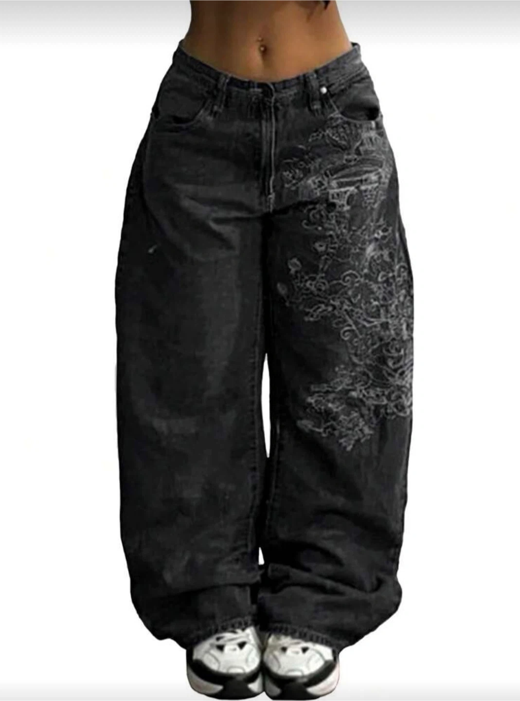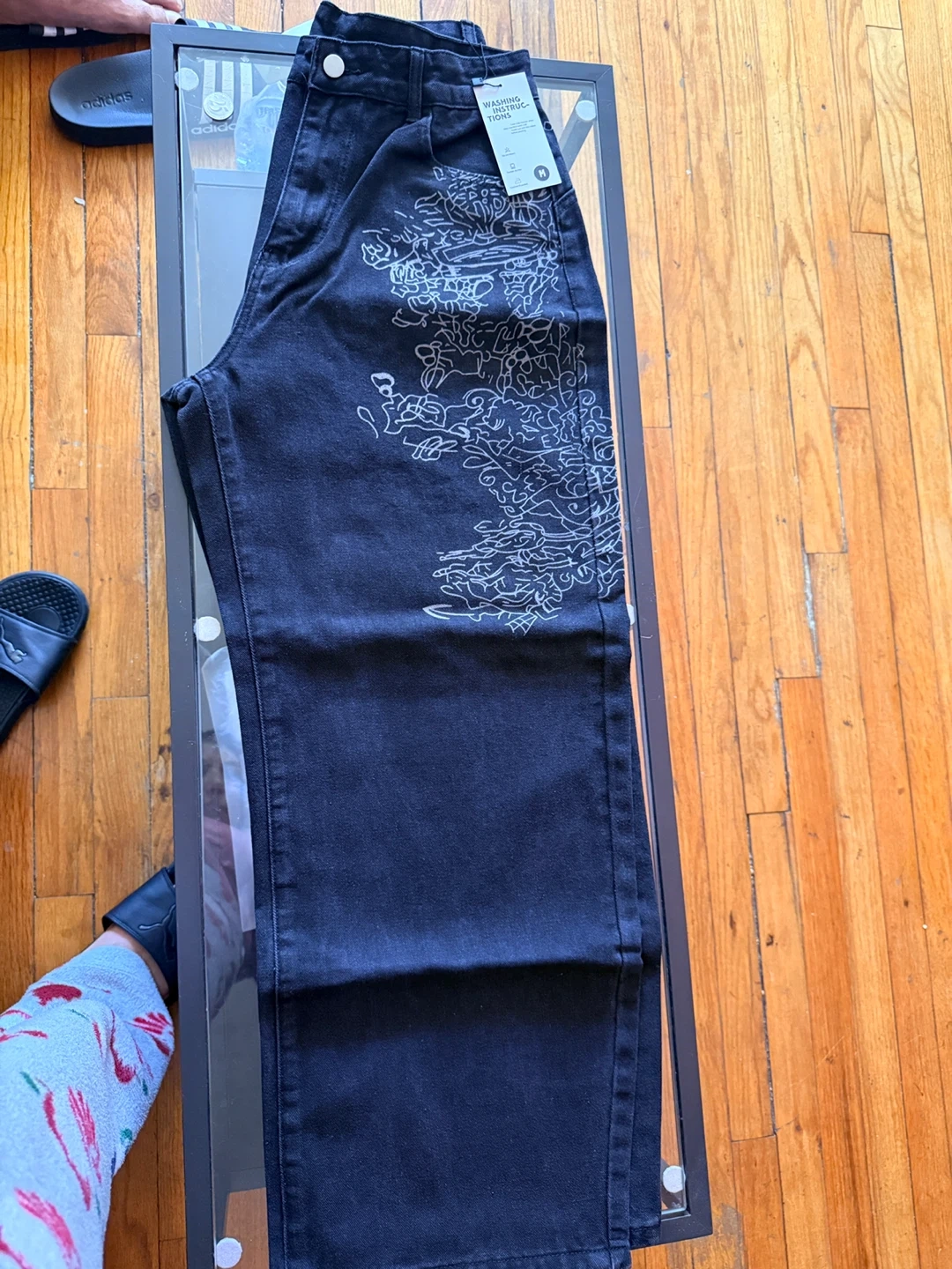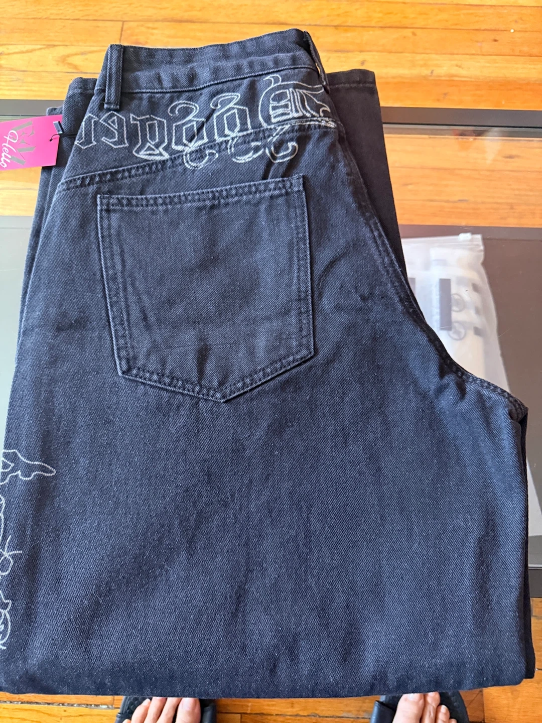Women's Hip Hop Baggy Jeans Wide Leg Mid-Low Waist Jeans Loose Boyfriends Jeans 90s Vintage Denim Pants,Spring Clothes For Women Black denim jeans with intricate white embroidery on the back pockets and front leg. and a relaxed fit. Size Medium.