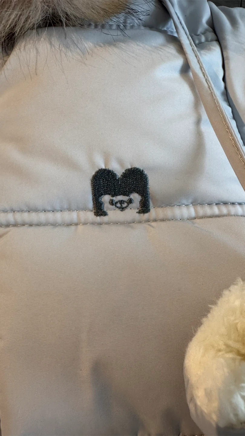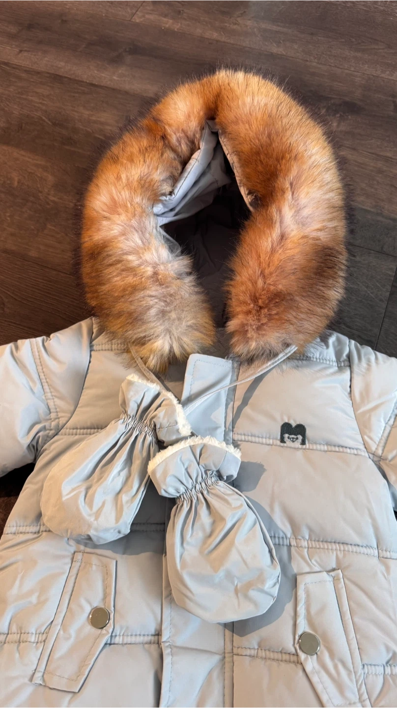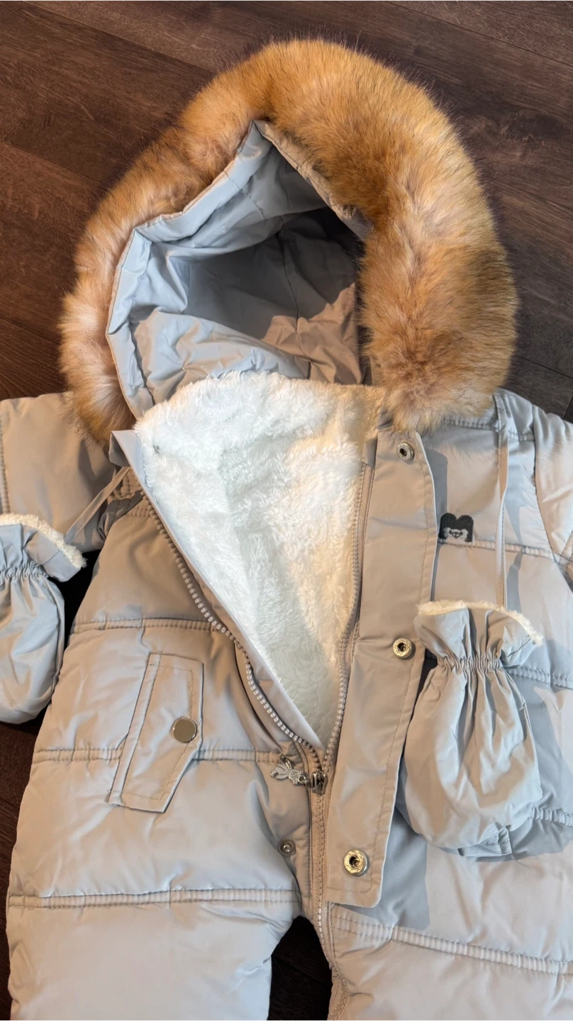 Selling a Mocheng baby snowsuit. It's a light blue colour with a faux fur trimmed hood and comes with matching mittens. The size is 66cm and it's made of 100% polyester. The product model is M-romper.