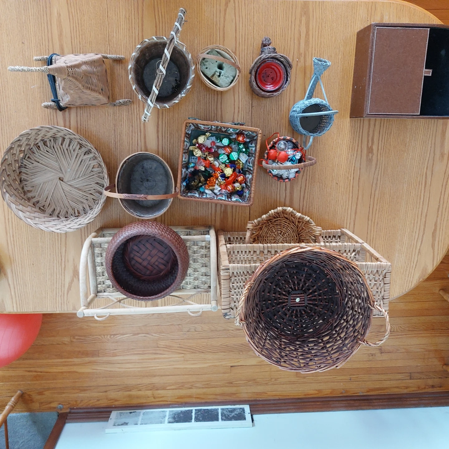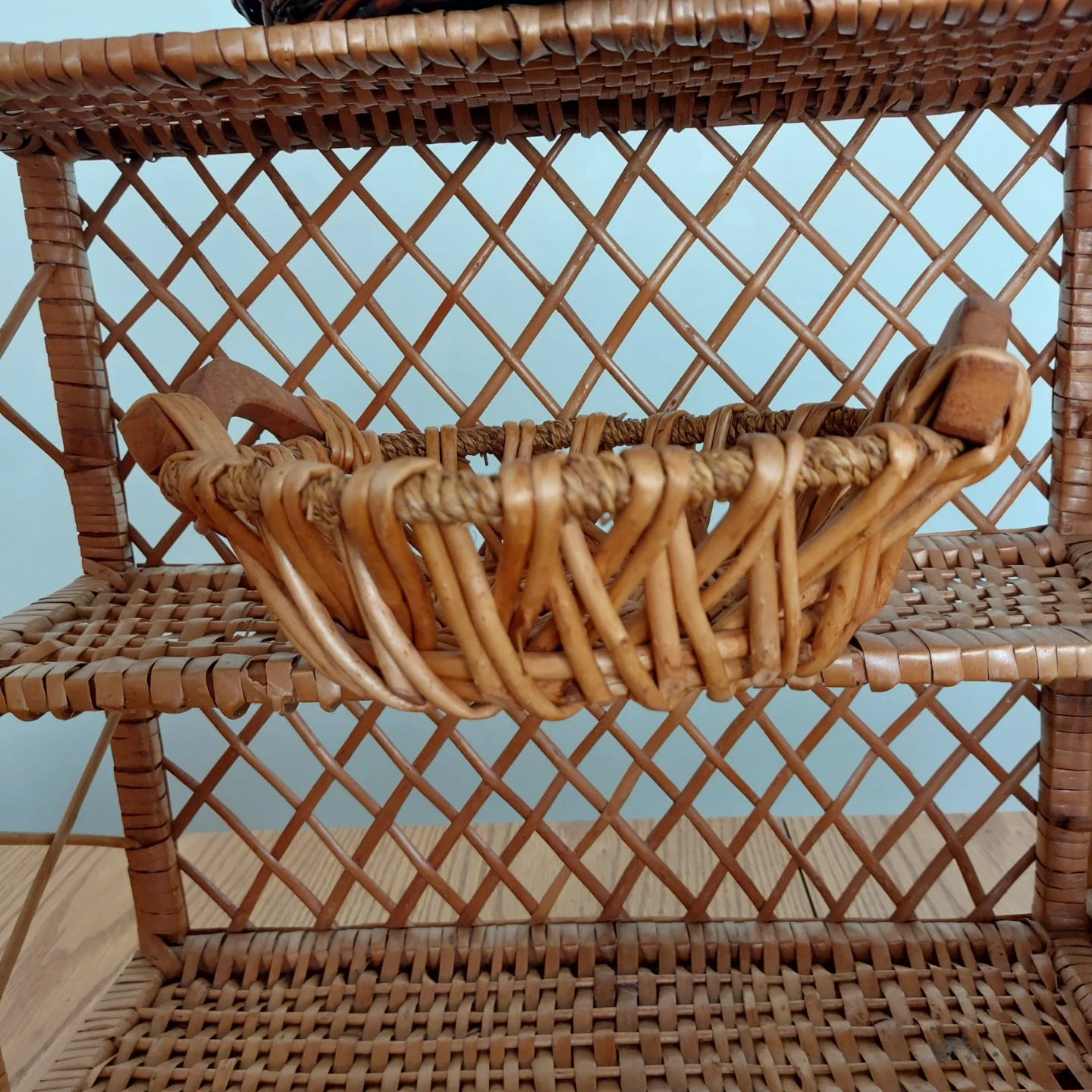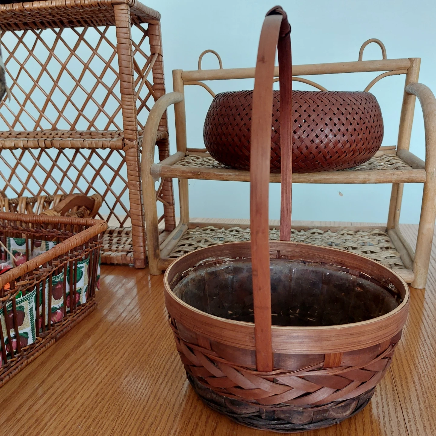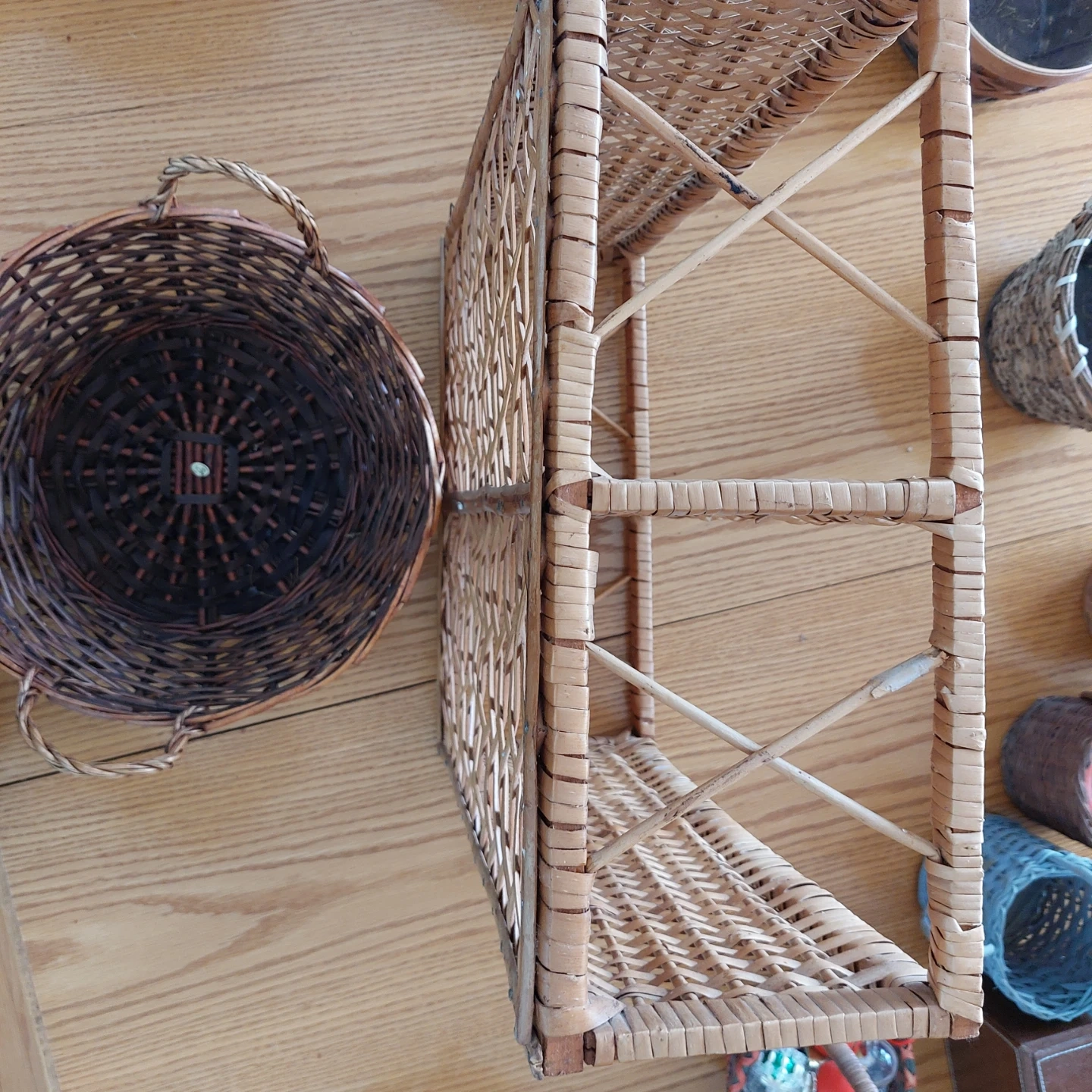 2woven wicker shelf units with diamond pattern sides. It comes with a small decorative basket. There are also other various wicker baskets shown in the photos. Prices are $10 per peice.