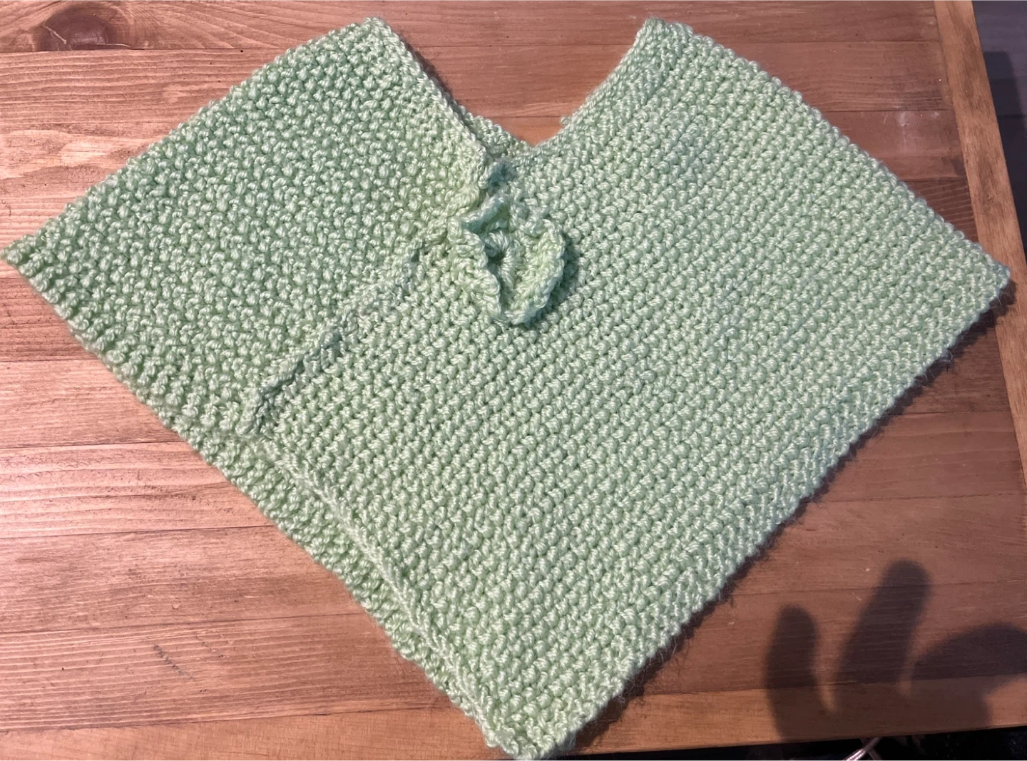 This light green knitted poncho is handmade. It's crafted from a soft, textured yarn with a tie detail at the neck. One size fits most.