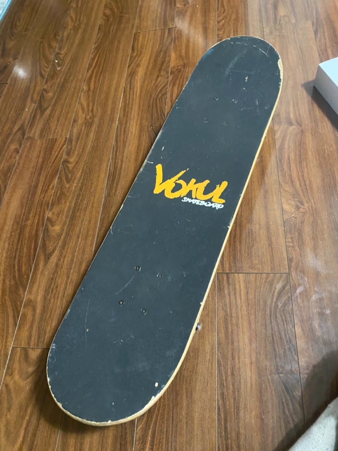 Selling a used Vokul skateboard. It has some wear and tear but is still a great ride! The board features a black deck with a yellow Vokul logo.