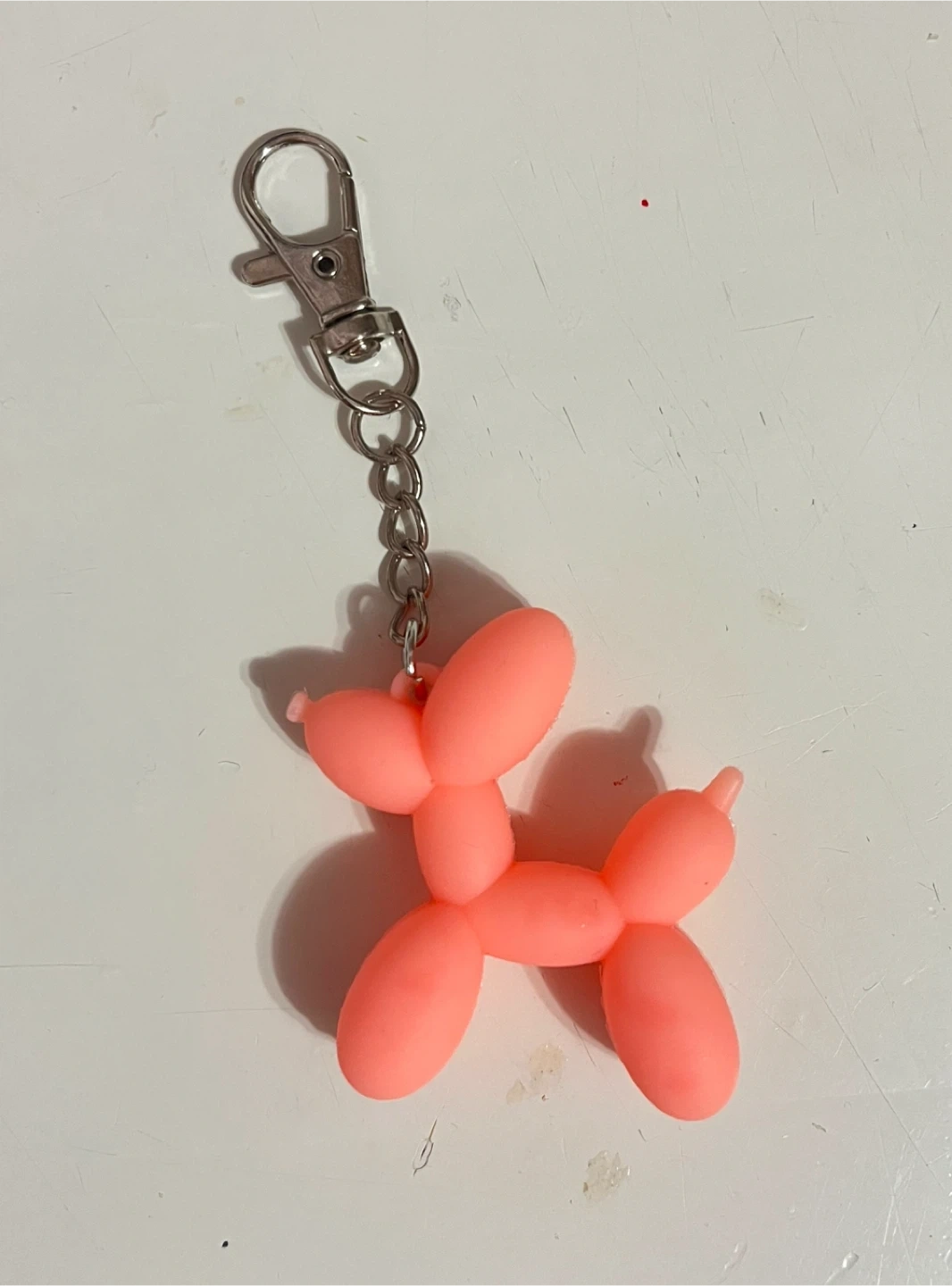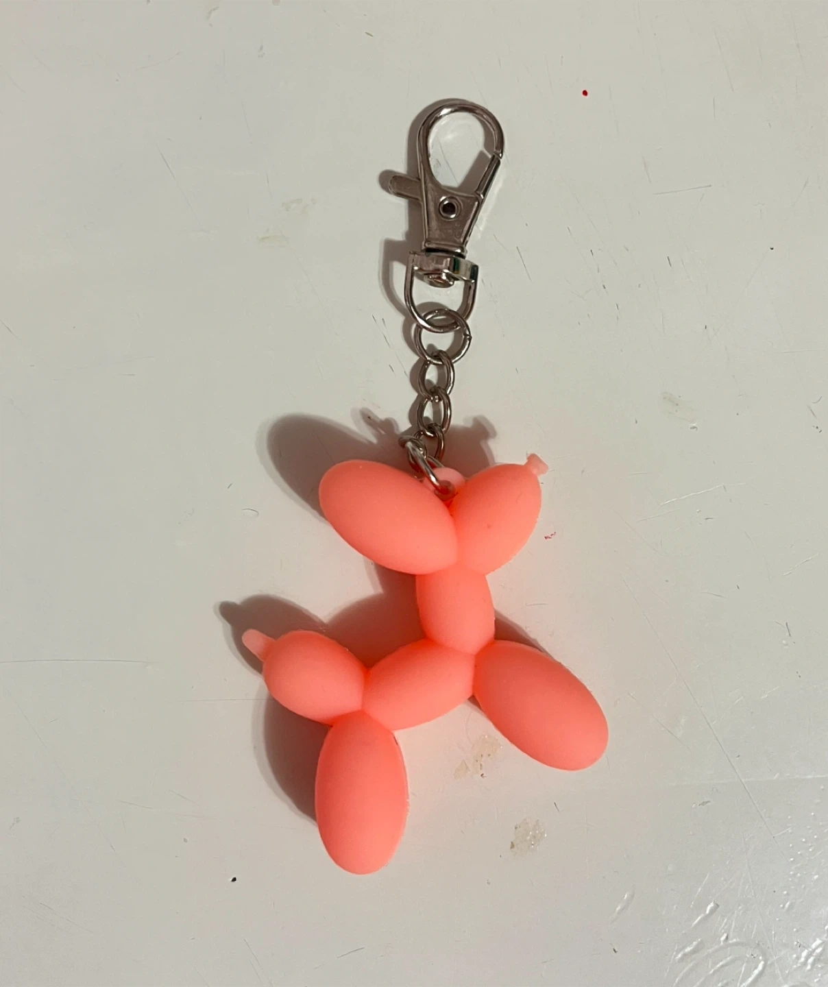 Selling a cute pink keychain shaped like a balloon dog. It's made of a flexible material and includes a silver clip. Perfect for adding a bit of fun to your keys or backpack!