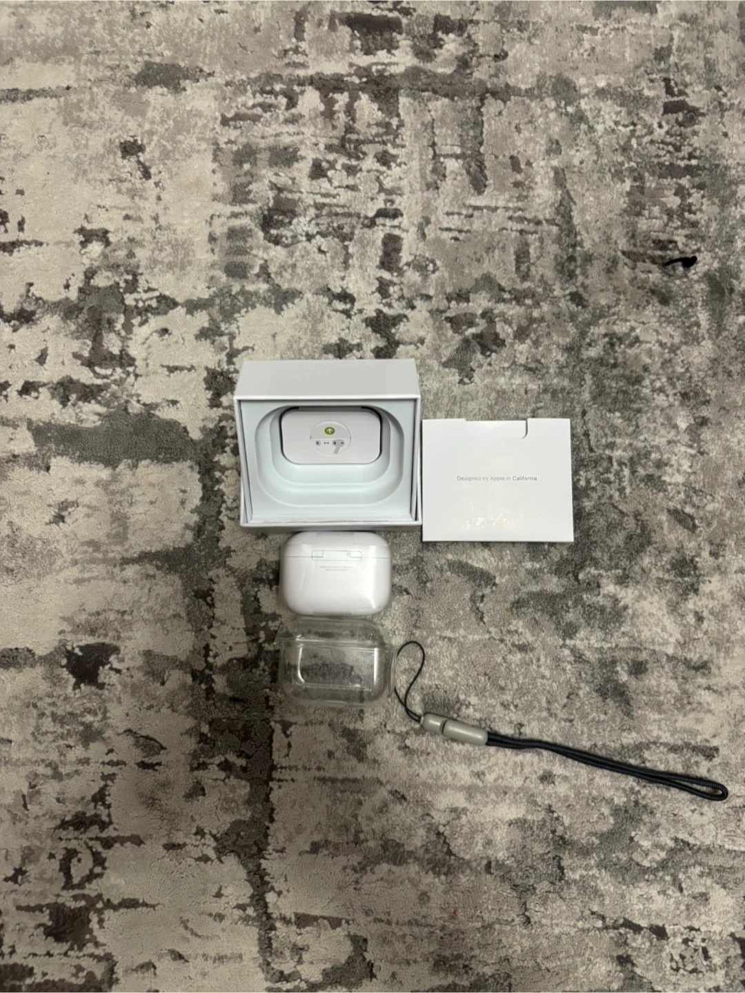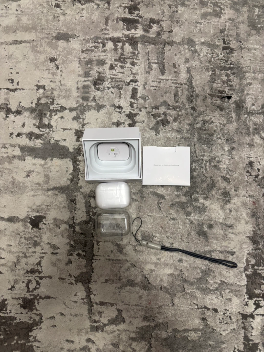 These are the Apple AirPods Pro (3rd generation) with a MagSafe charging case. They come with a clear protective case and a lanyard. Includes extra ear tip sizes (XS, S, M, L) for a customizable fit. Designed by Apple in California.