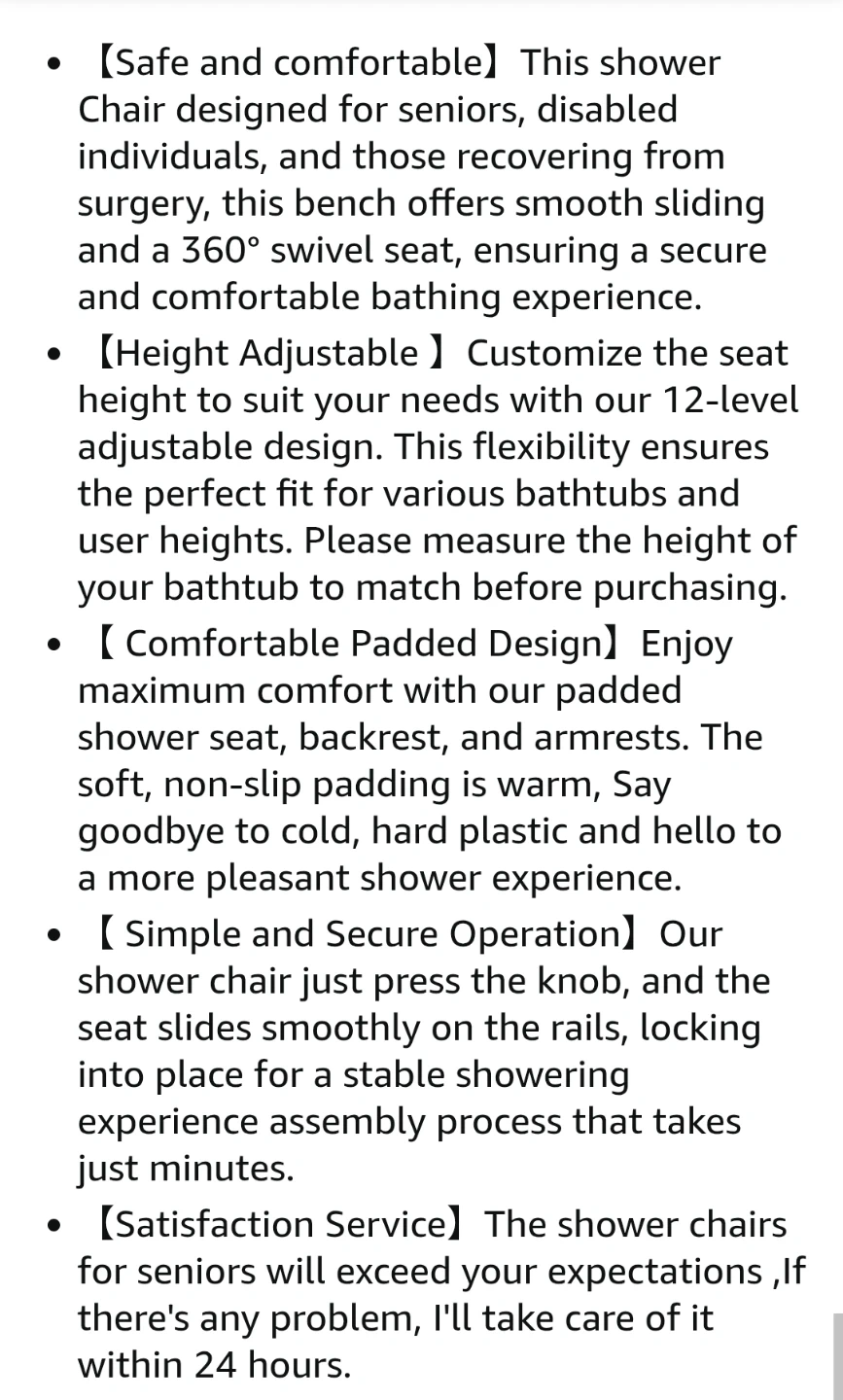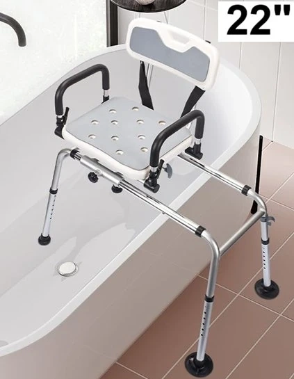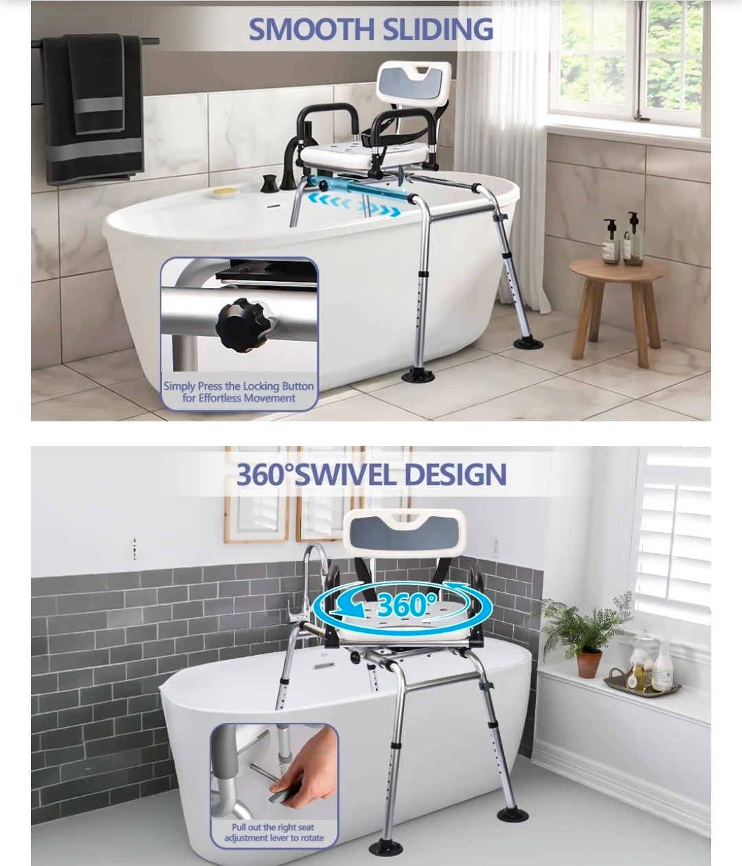 This Auckyeer shower chair tub transfer bench features a 360° swivel seat and height adjustable, pivoting arms, designed for elderly individuals.