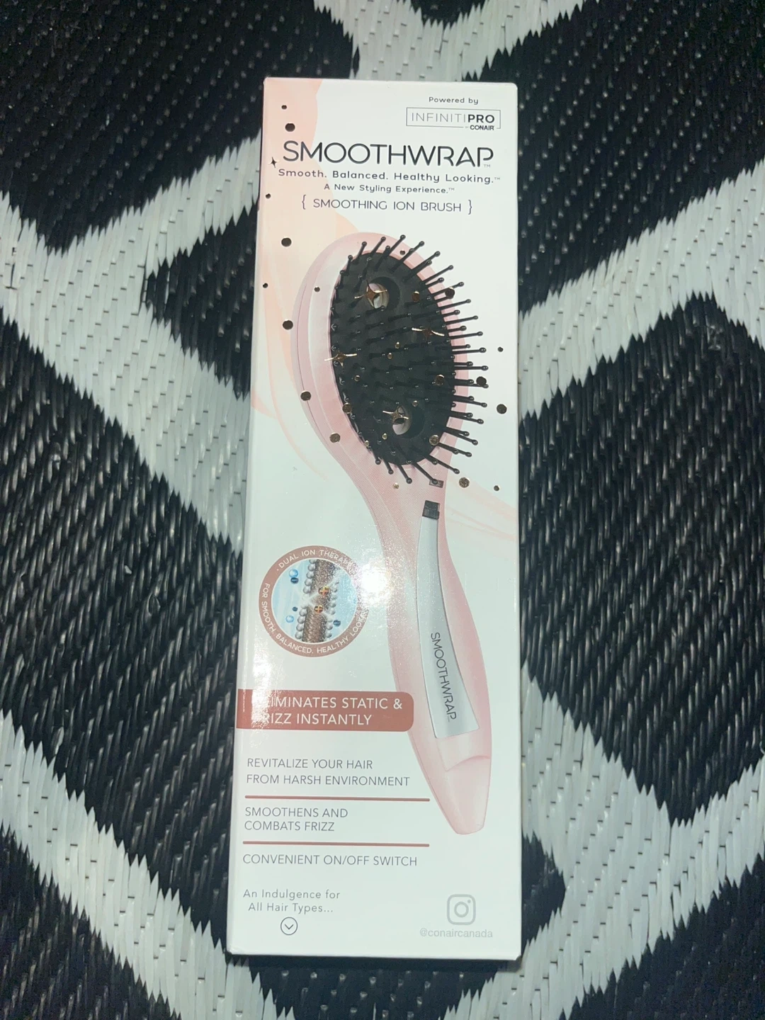 This is the Conair InfinitiPro SmoothWrap Smoothing Ion Brush. It revitalizes your hair from harsh environments and combats frizz. It features a convenient on/off switch and is an indulgence for all hair types.