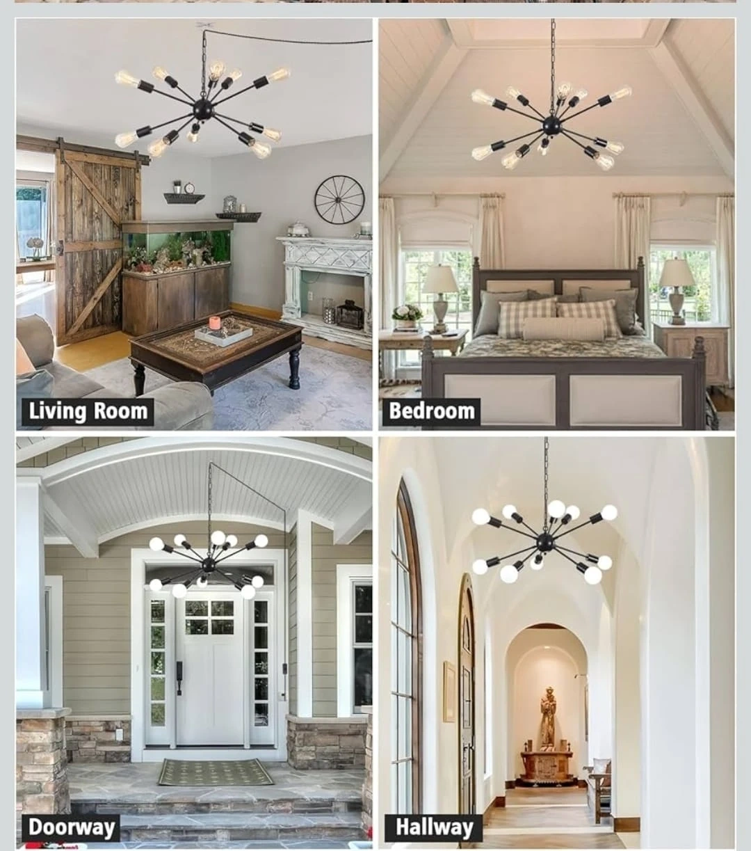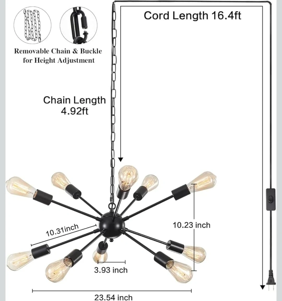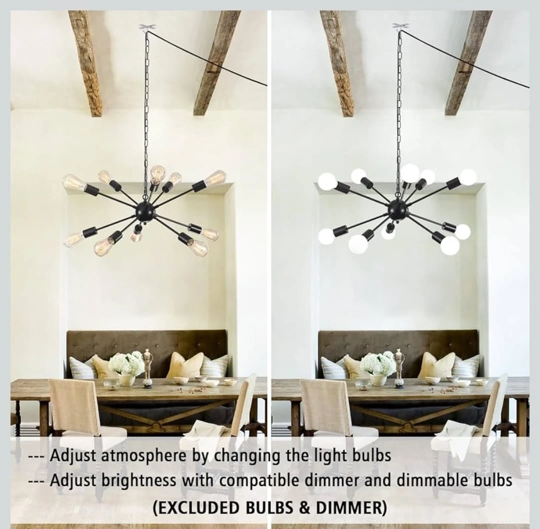 This 12-light sputnik chandelier features a black finish and a plug-in design. It has a cord length of 16.4ft and a chain length of 4.92ft, adjustable with a removable chain and buckle. The fixture's diameter is 23.54 inches. Bulbs and dimmer are excluded. It's great for a dining room, living room, or bedroom!